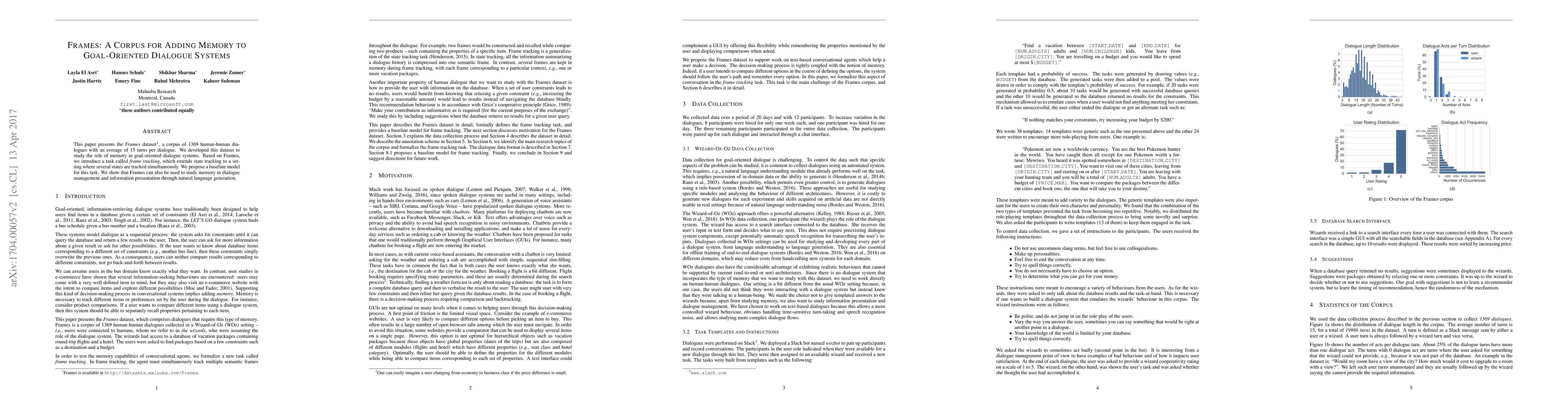 This paper introduces the Frames dataset, a corpus of 1369 human-human dialogues aimed at studying memory in goal-oriented dialogue systems. It proposes a new frame tracking task and introduces a baseline model, demonstrating the dataset's utility for memory-related dialogue management and natural language generation.