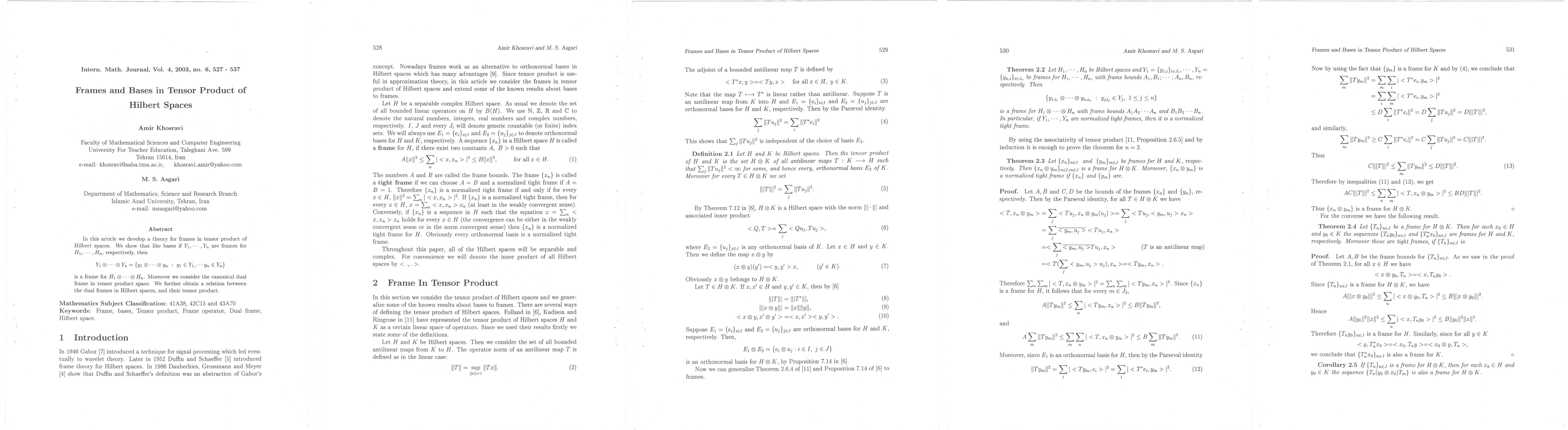 In this article we develop a theory for frames in tensor product of Hilbert spaces. We show that like bases if Y_1, Y_2, \cdot \cdot \cdot, Y_n are frames for H_1,H_2, \cdot \cdot \cdot, H_n, respectively, then Y_1\otimesY_2\otimes...\otimesY_n is a frame for H_\otimes1H_2\otimes \cdot \cdot \cdot \otimesH_n. Moreover we consider the canonical dual frame in tensor product space. We further obtain a relation between the dual frames in Hilbert spaces, and their tensor product.