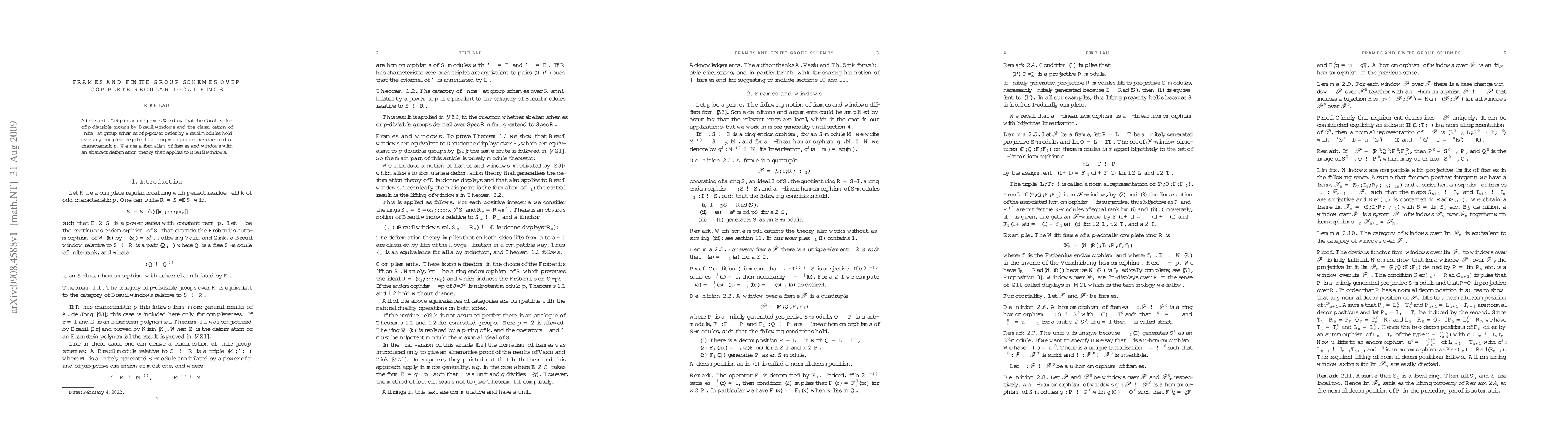 The paper establishes the classification of p-divisible groups and finite flat group schemes over complete regular local rings with perfect residue fields of characteristic p, using Breuil modules and a formalism of frames and windows within an abstract deformation theory. This result extends the known classifications to a broader class of rings beyond just characteristic zero.