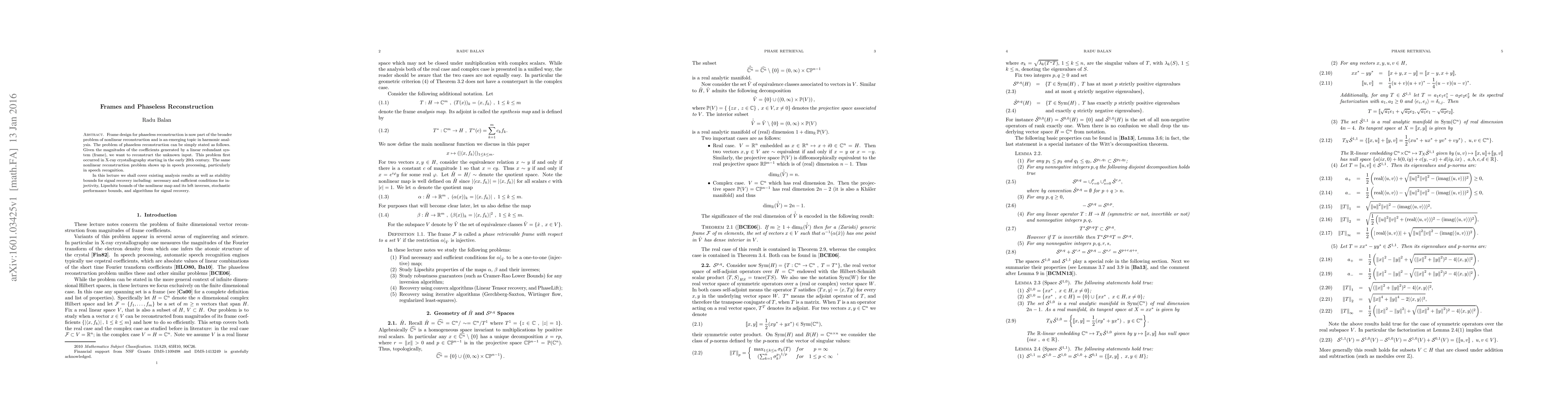 Frame design for phaseless reconstruction is now part of the broader problem of nonlinear reconstruction and is an emerging topic in harmonic analysis. The problem of phaseless reconstruction can be simply stated as follows. Given the magnitudes of the coefficients generated by a linear redundant system (frame), we want to reconstruct the unknown input. This problem first occurred in X-ray crystallography starting in the early 20th century. The same nonlinear reconstruction problem shows up in speech processing, particularly in speech recognition. In this lecture we shall cover existing analysis results as well as stability bounds for signal recovery including: necessary and sufficient conditions for injectivity, Lipschitz bounds of the nonlinear map and its left inverses, stochastic performance bounds, and algorithms for signal recovery.