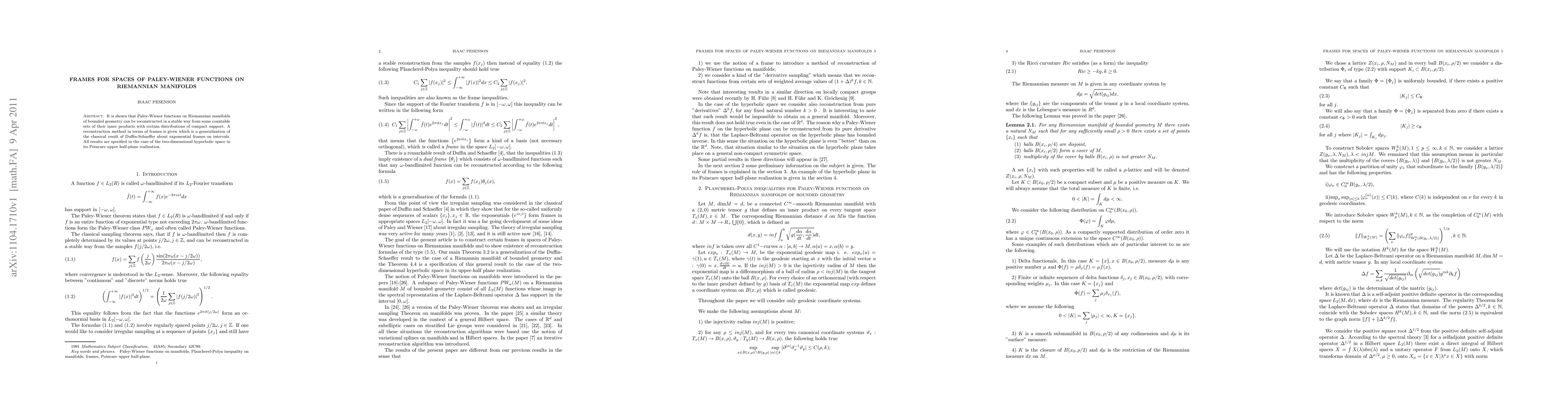 This paper presents a reconstruction method for Paley-Wiener functions on Riemannian manifolds using frames, generalizing the Duffin-Schaeffer result for exponential frames. The method is demonstrated specifically for the two-dimensional hyperbolic space in its Poincaré upper half-plane realization.