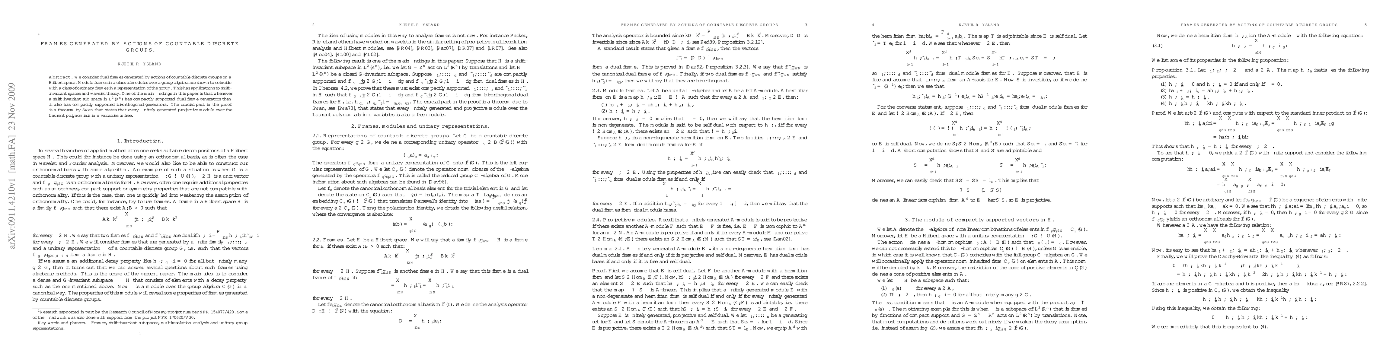 We consider dual frames generated by actions of countable discrete groups on a Hilbert space. Module frames in a class of modules over a group algebra are shown to coincide with a class of ordinary frames in a representation of the group. This has applications to shift-invariant spaces and wavelet theory. One of the main findings in this paper is that whenever a shift-invariant sub space in L2(Rn) has compactly supported dual frame generators then it also has compactly supported bi-orthogonal generators. The crucial part in the proof is a theorem by Swan that states that every finitely generated projective module over the Laurent polynomials in n variables is free.