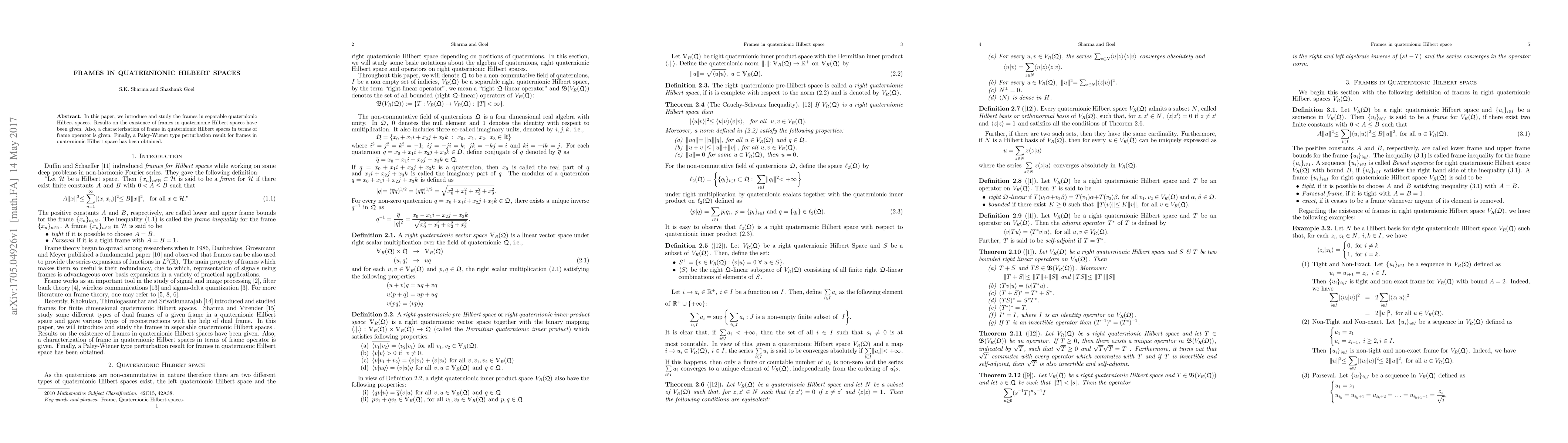 This paper explores frames in quaternionic Hilbert spaces, proving their existence and characterizing them via frame operators. It also presents a perturbation result akin to the Paley-Wiener theorem for these frames.