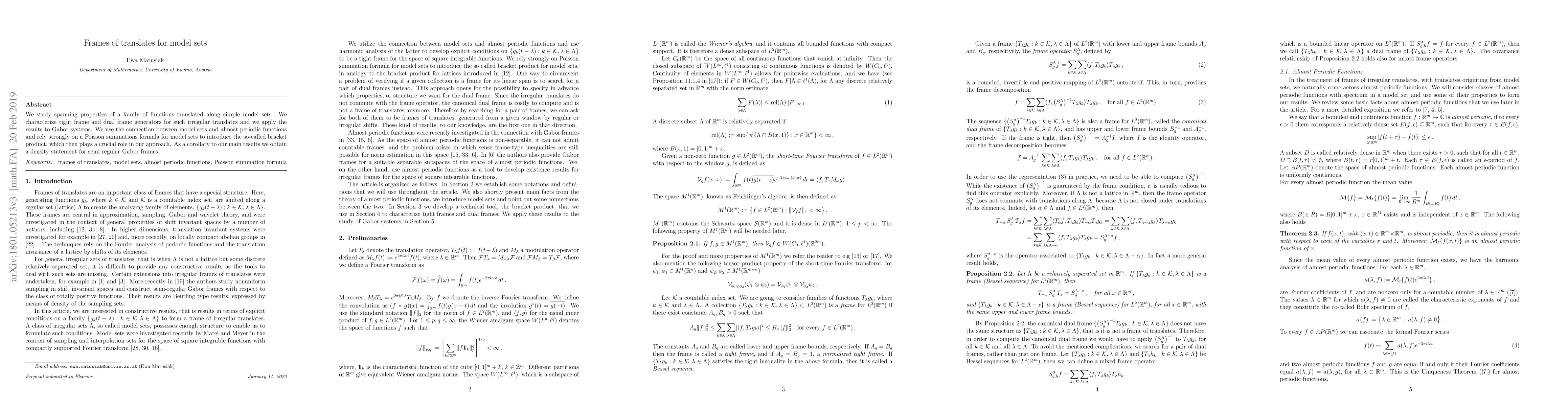 Researchers study how functions translated along model sets behave as frame generators for Gabor systems, discovering a connection between model sets and almost periodic functions.