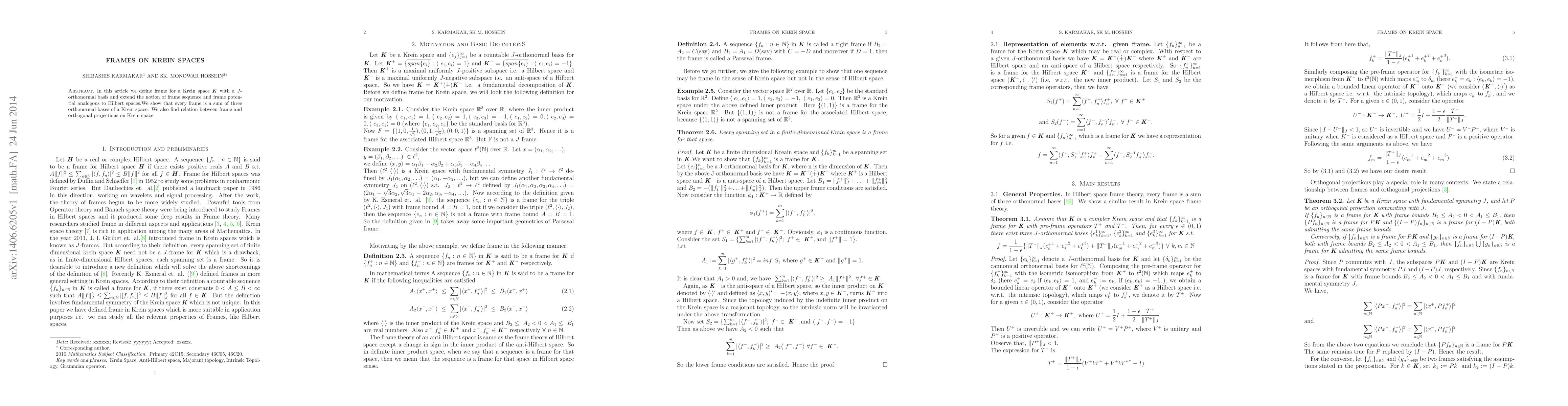 In this article we define frame for a Krein space K with a J-orthonormal basis and extend the notion of frame sequence and frame potential analogous to Hilbert spaces.We show that every frame is a sum of three orthonormal bases of a Krein space. We also find relation between frame and orthogonal projections on Krein space.