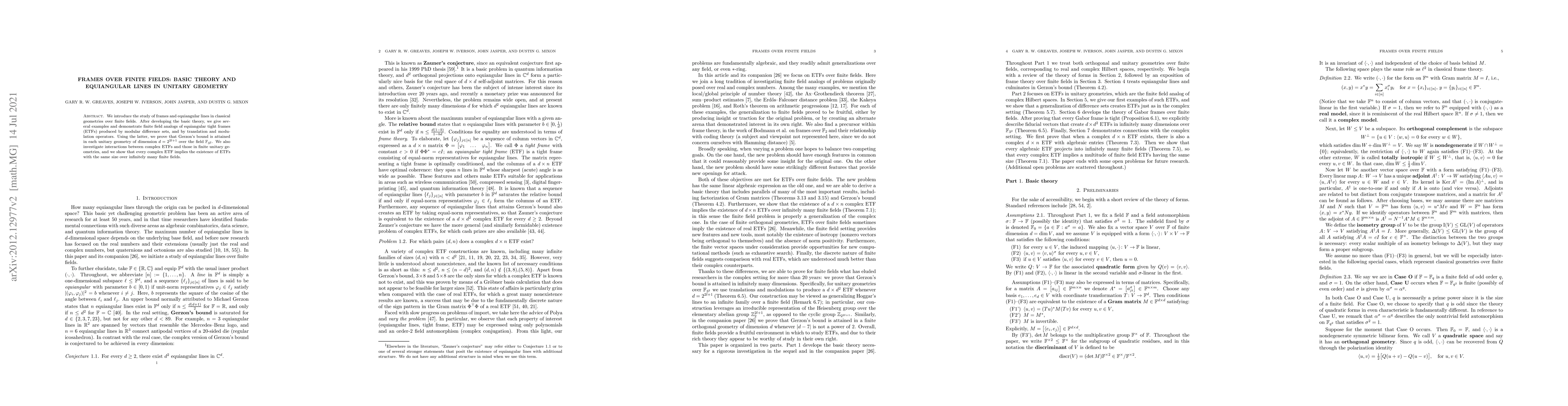 This paper develops the foundational theory of frames and equiangular lines in classical geometries over finite fields, showcasing examples of equiangular tight frames derived from modular difference sets and translation/modulation operators. It proves that Gerzon's bound is achieved in specific unitary geometries and explores connections between complex and finite field equiangular tight frames.