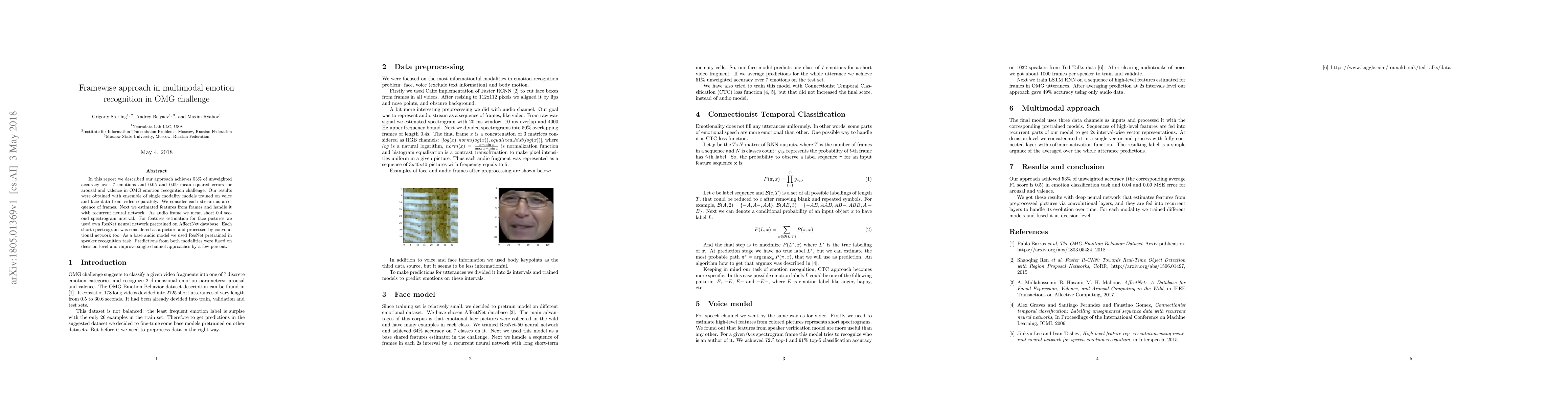In this report we described our approach achieves $53\%$ of unweighted accuracy over $7$ emotions and $0.05$ and $0.09$ mean squared errors for arousal and valence in OMG emotion recognition challenge. Our results were obtained with ensemble of single modality models trained on voice and face data from video separately. We consider each stream as a sequence of frames. Next we estimated features from frames and handle it with recurrent neural network. As audio frame we mean short $0.4$ second spectrogram interval. For features estimation for face pictures we used own ResNet neural network pretrained on AffectNet database. Each short spectrogram was considered as a picture and processed by convolutional network too. As a base audio model we used ResNet pretrained in speaker recognition task. Predictions from both modalities were fused on decision level and improve single-channel approaches by a few percent