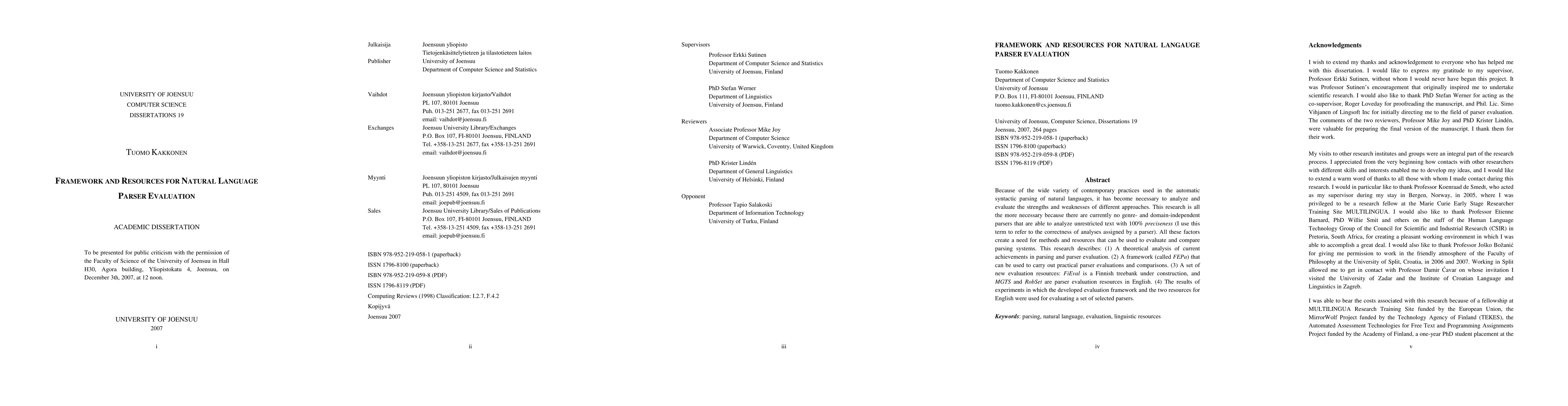 Because of the wide variety of contemporary practices used in the automatic syntactic parsing of natural languages, it has become necessary to analyze and evaluate the strengths and weaknesses of different approaches. This research is all the more necessary because there are currently no genre- and domain-independent parsers that are able to analyze unrestricted text with 100% preciseness (I use this term to refer to the correctness of analyses assigned by a parser). All these factors create a need for methods and resources that can be used to evaluate and compare parsing systems. This research describes: (1) A theoretical analysis of current achievements in parsing and parser evaluation. (2) A framework (called FEPa) that can be used to carry out practical parser evaluations and comparisons. (3) A set of new evaluation resources: FiEval is a Finnish treebank under construction, and MGTS and RobSet are parser evaluation resources in English. (4) The results of experiments in which the developed evaluation framework and the two resources for English were used for evaluating a set of selected parsers.