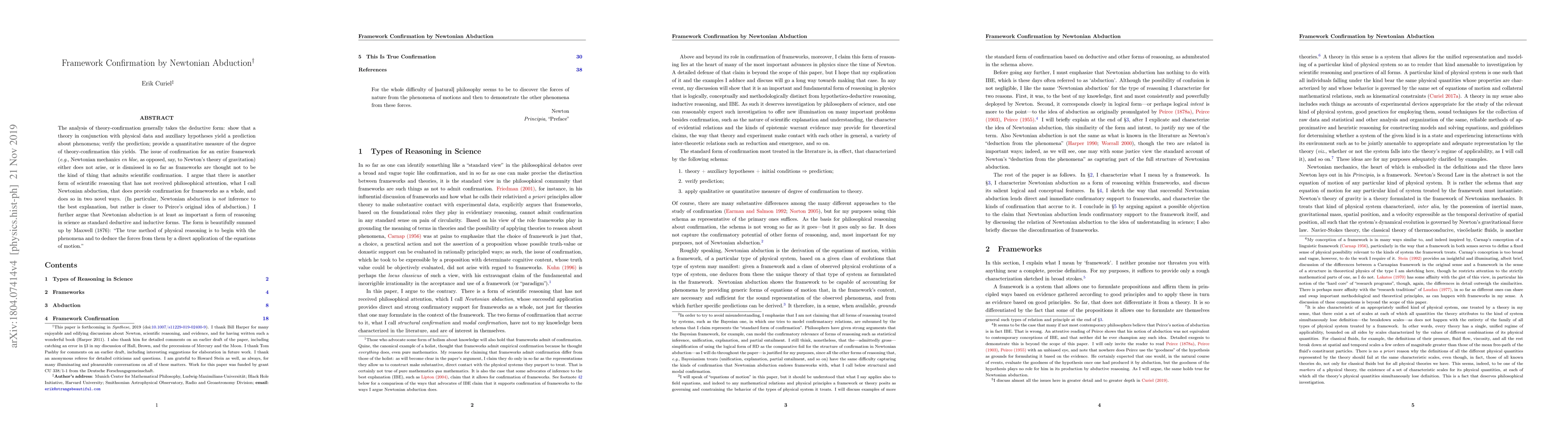 The analysis of theory-confirmation generally takes the deductive form: show that a theory in conjunction with physical data and auxiliary hypotheses yield a prediction about phenomena; verify the prediction; provide a quantitative measure of the degree of theory-confirmation this yields. The issue of confirmation for an entire framework (e.g, Newtonian mechanics en bloc, as opposed, say, to Newton's theory of gravitation) either does not arise, or is dismissed in so far as frameworks are thought not to be the kind of thing that admits scientific confirmation. I argue that there is another form of scientific reasoning that has not received philosophical attention, what I call 'Newtonian abduction', that does provide confirmation for frameworks as a whole, and does so in two novel ways. (In particular, Newtonian abduction is not inference to the best explanation, but rather is closer to Peirce's original idea of abduction.) I further argue that Newtonian abduction is at least as important a form of reasoning in science as standard deductive and inductive forms. The form is beautifully summed up by Maxwell (1876): "The true method of physical reasoning is to begin with the phenomena and to deduce the forces from them by a direct application of the equations of motion."