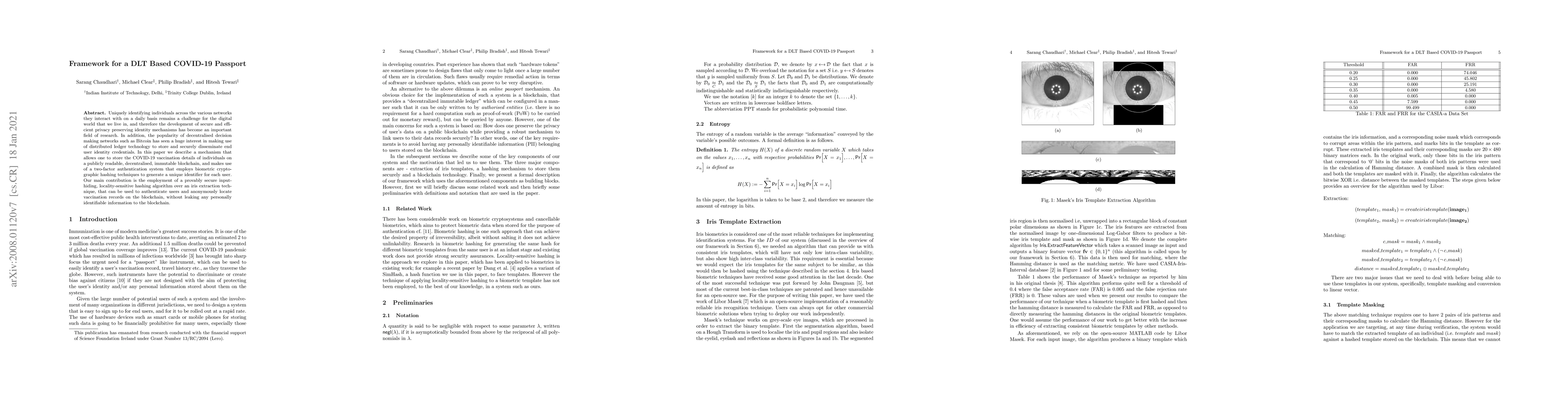 Uniquely identifying individuals across the various networks they interact with on a daily basis remains a challenge for the digital world that we live in, and therefore the development of secure and efficient privacy preserving identity mechanisms has become an important field of research. In addition, the popularity of decentralised decision making networks such as Bitcoin has seen a huge interest in making use of distributed ledger technology to store and securely disseminate end user identity credentials. In this paper we describe a mechanism that allows one to store the COVID-19 vaccination details of individuals on a publicly readable, decentralised, immutable blockchain, and makes use of a two-factor authentication system that employs biometric cryptographic hashing techniques to generate a unique identifier for each user. Our main contribution is the employment of a provably secure input-hiding, locality-sensitive hashing algorithm over an iris extraction technique, that can be used to authenticate users and anonymously locate vaccination records on the blockchain, without leaking any personally identifiable information to the blockchain.