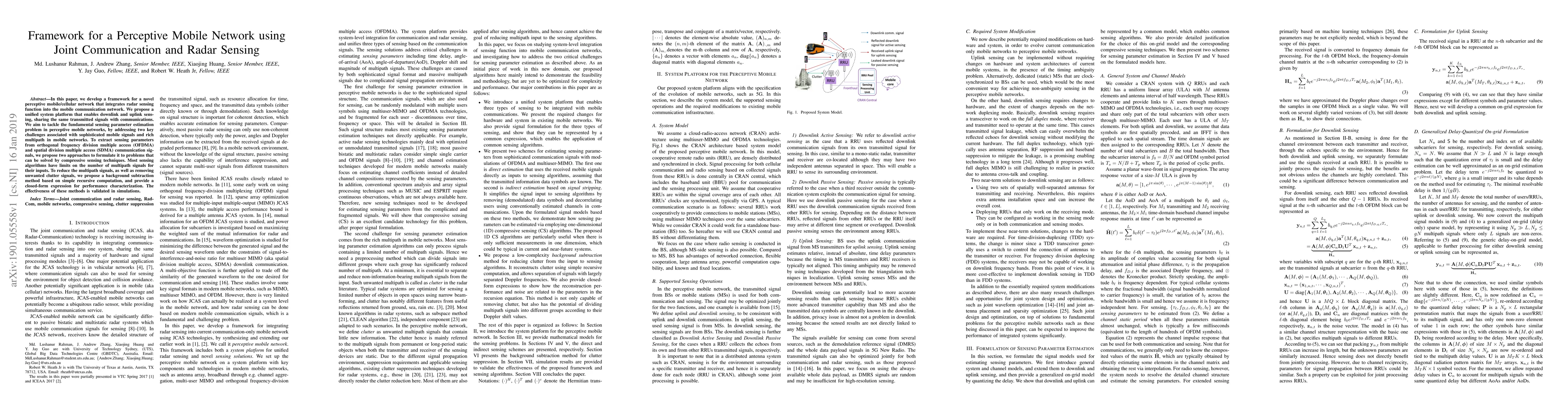 In this paper, we develop a framework for a novel perceptive mobile/cellular network that integrates radar sensing function into the mobile communication network. We propose a unified system platform that enables downlink and uplink sensing, sharing the same transmitted signals with communications. We aim to tackle the fundamental sensing parameter estimation problem in perceptive mobile networks, by addressing two key challenges associated with sophisticated mobile signals and rich multipath in mobile networks. To extract sensing parameters from orthogonal frequency division multiple access (OFDMA) and spatial division multiple access (SDMA) communication signals, we propose two approaches to formulate it to problems that can be solved by compressive sensing techniques. Most sensing algorithms have limits on the number of multipath signals for their inputs. To reduce the multipath signals, as well as removing unwanted clutter signals, we propose a background subtraction method based on simple recursive computation, and provide a closed-form expression for performance characterization. The effectiveness of these methods is validated in simulations.