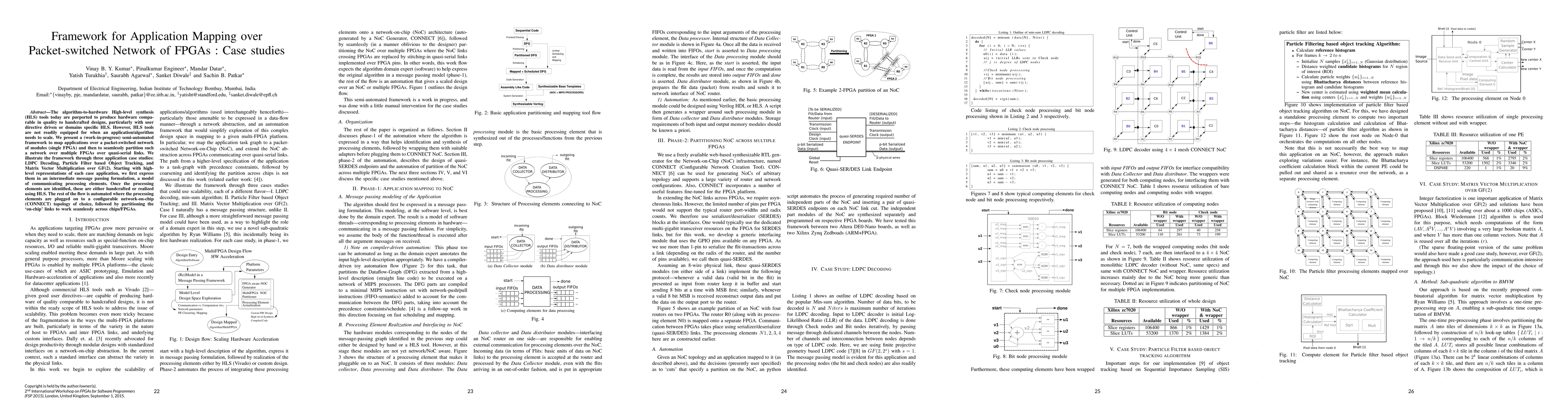 The algorithm-to-hardware High-level synthesis (HLS) tools today are purported to produce hardware comparable in quality to handcrafted designs, particularly with user directive driven or domains specific HLS. However, HLS tools are not readily equipped for when an application/algorithm needs to scale. We present a (work-in-progress) semi-automated framework to map applications over a packet-switched network of modules (single FPGA) and then to seamlessly partition such a network over multiple FPGAs over quasi-serial links. We illustrate the framework through three application case studies: LDPC Decoding, Particle Filter based Object Tracking, and Matrix Vector Multiplication over GF(2). Starting with high-level representations of each case application, we first express them in an intermediate message passing formulation, a model of communicating processing elements. Once the processing elements are identified, these are either handcrafted or realized using HLS. The rest of the flow is automated where the processing elements are plugged on to a configurable network-on-chip (CONNECT) topology of choice, followed by partitioning the 'on-chip' links to work seamlessly across chips/FPGAs.