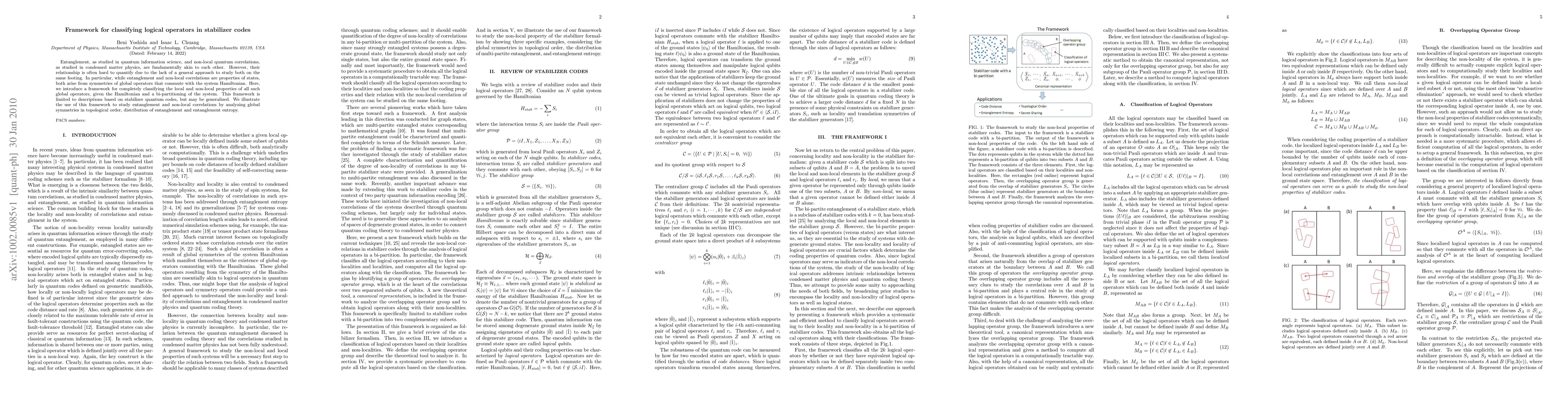 The research introduces a framework for classifying local and non-local properties of global operators in stabilizer codes, given the Hamiltonian and a bi-partitioning of the system, using canonical representations and analyzing symmetries in topological order, entanglement, and entanglement entropy.