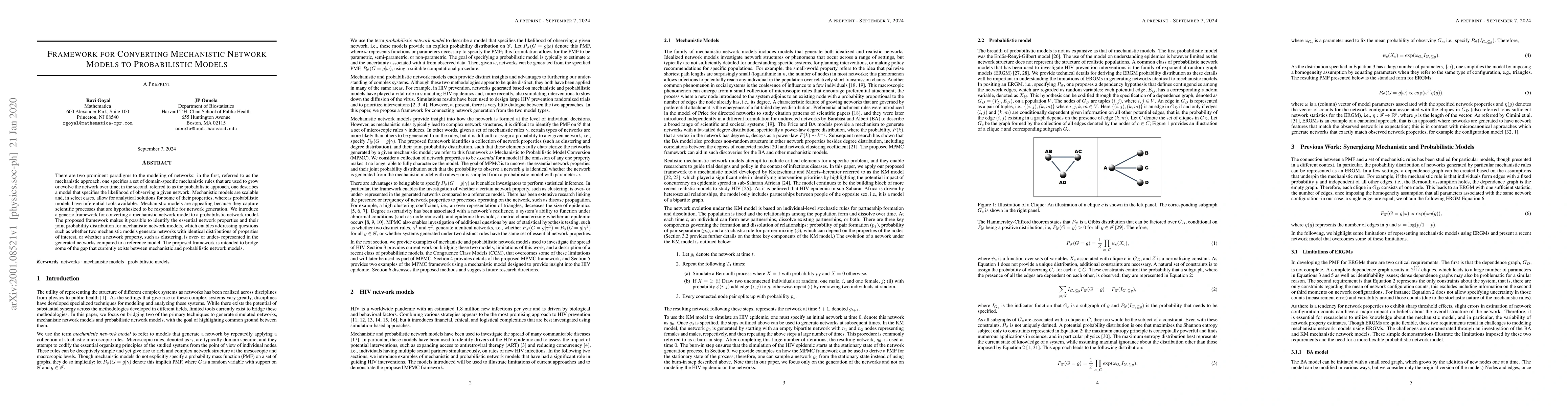 This paper introduces a framework for converting mechanistic network models into probabilistic models, enabling the identification of essential network properties and their joint probability distributions. The framework aims to bridge the gap between mechanistic and probabilistic modeling, facilitating comparisons between generated networks and reference models.