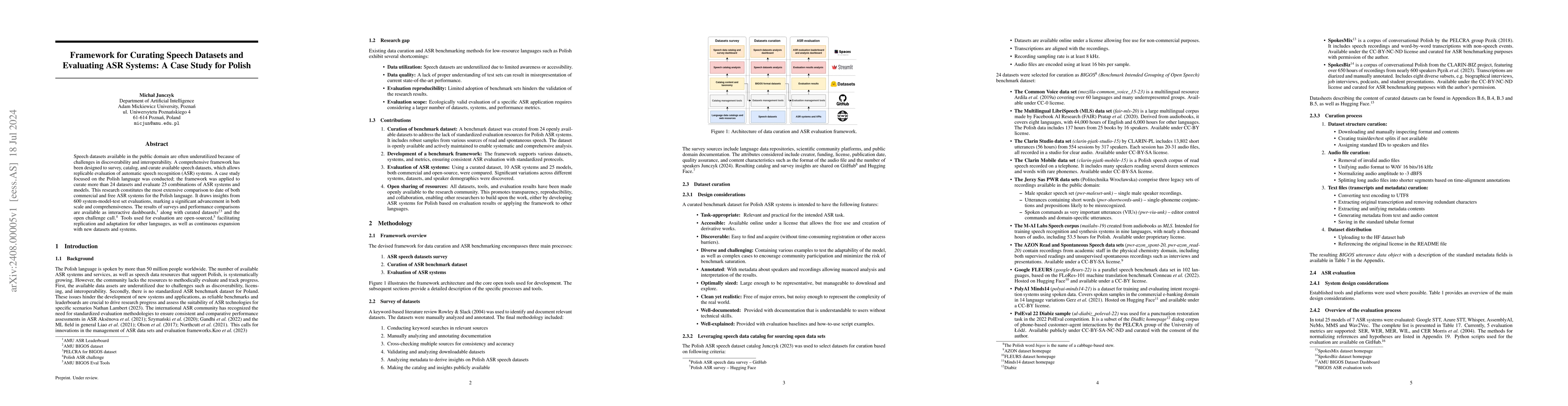 This paper presents a framework for curating speech datasets and evaluating automatic speech recognition (ASR) systems, focusing on Polish. It details the curation of over 24 datasets and assesses 25 ASR system combinations, marking the most extensive comparison of ASR systems for Polish to date. Tools and results are openly available to support replication and further language evaluations.
