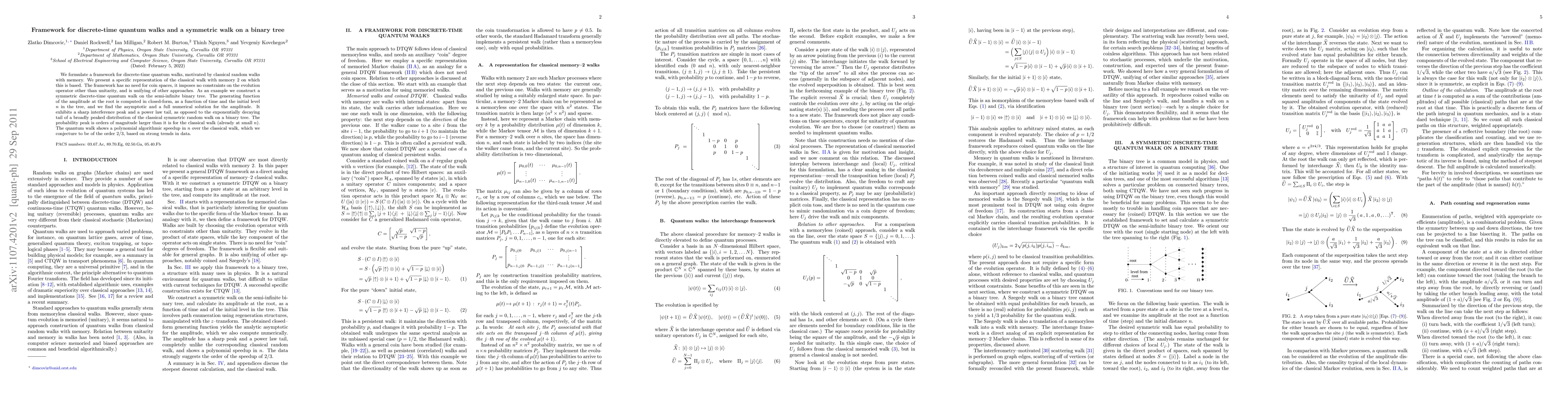 We formulate a framework for discrete-time quantum walks, motivated by classical random walks with memory. We present a specific representation of the classical walk with memory 2 on which this is based. The framework has no need for coin spaces, it imposes no constraints on the evolution operator other than unitarity, and is unifying of other approaches. As an example we construct a symmetric discrete-time quantum walk on the semi-infinite binary tree. The generating function of the amplitude at the root is computed in closed-form, as a function of time and the initial level n in the tree, and we find the asymptotic and a full numerical solution for the amplitude. It exhibits a sharp interference peak and a power law tail, as opposed to the exponentially decaying tail of a broadly peaked distribution of the classical symmetric random walk on a binary tree. The probability peak is orders of magnitude larger than it is for the classical walk (already at small n). The quantum walk shows a polynomial algorithmic speedup in n over the classical walk, which we conjecture to be of the order 2/3, based on strong trends in data.