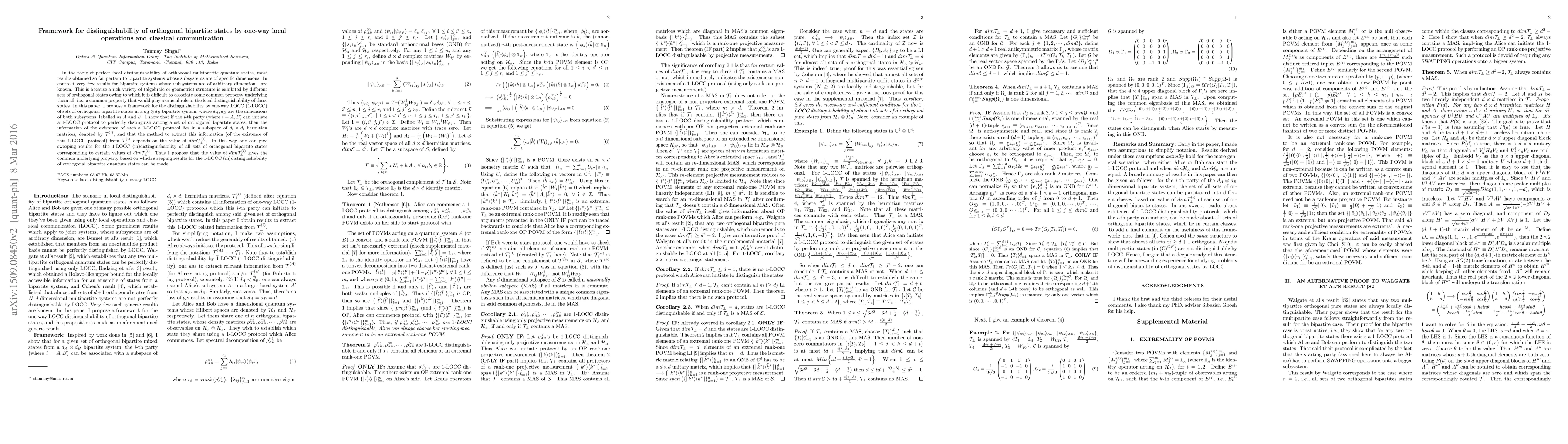A framework is proposed to distinguish between orthogonal bipartite quantum states using one-way local operations and classical communication, with the key finding that the distinguishability depends on a subspace of hermitian matrices related to each subsystem's dimension.