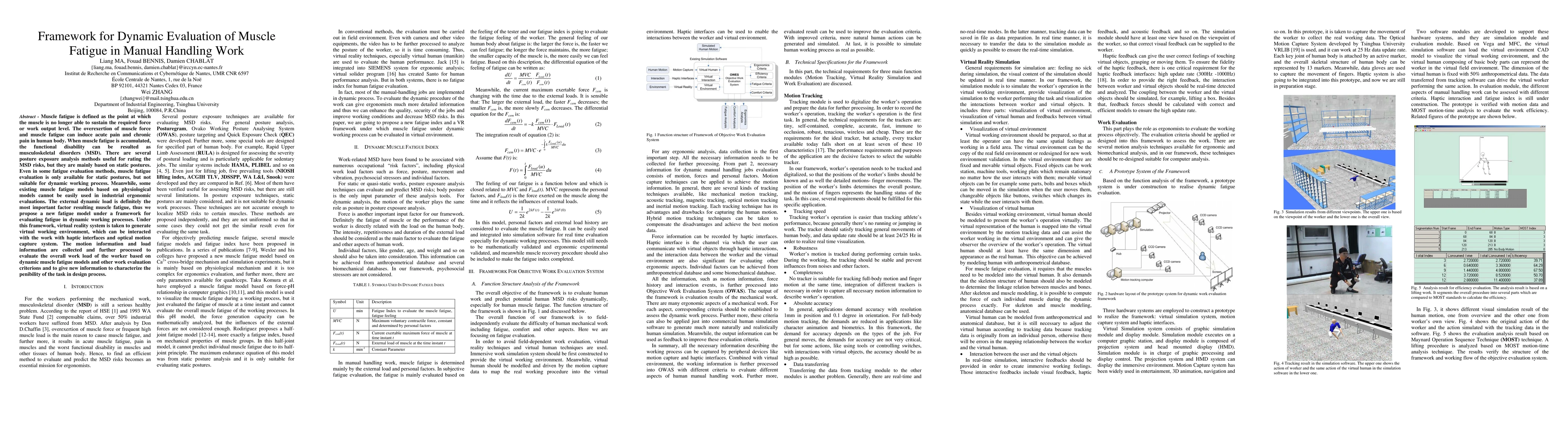 Muscle fatigue is defined as the point at which the muscle is no longer able to sustain the required force or work output level. The overexertion of muscle force and muscle fatigue can induce acute pain and chronic pain in human body. When muscle fatigue is accumulated, the functional disability can be resulted as musculoskeletal disorders (MSD). There are several posture exposure analysis methods useful for rating the MSD risks, but they are mainly based on static postures. Even in some fatigue evaluation methods, muscle fatigue evaluation is only available for static postures, but not suitable for dynamic working process. Meanwhile, some existing muscle fatigue models based on physiological models cannot be easily used in industrial ergonomic evaluations. The external dynamic load is definitely the most important factor resulting muscle fatigue, thus we propose a new fatigue model under a framework for evaluating fatigue in dynamic working processes. Under this framework, virtual reality system is taken to generate virtual working environment, which can be interacted with the work with haptic interfaces and optical motion capture system. The motion information and load information are collected and further processed to evaluate the overall work load of the worker based on dynamic muscle fatigue models and other work evaluation criterions and to give new information to characterize the penibility of the task in design process.
