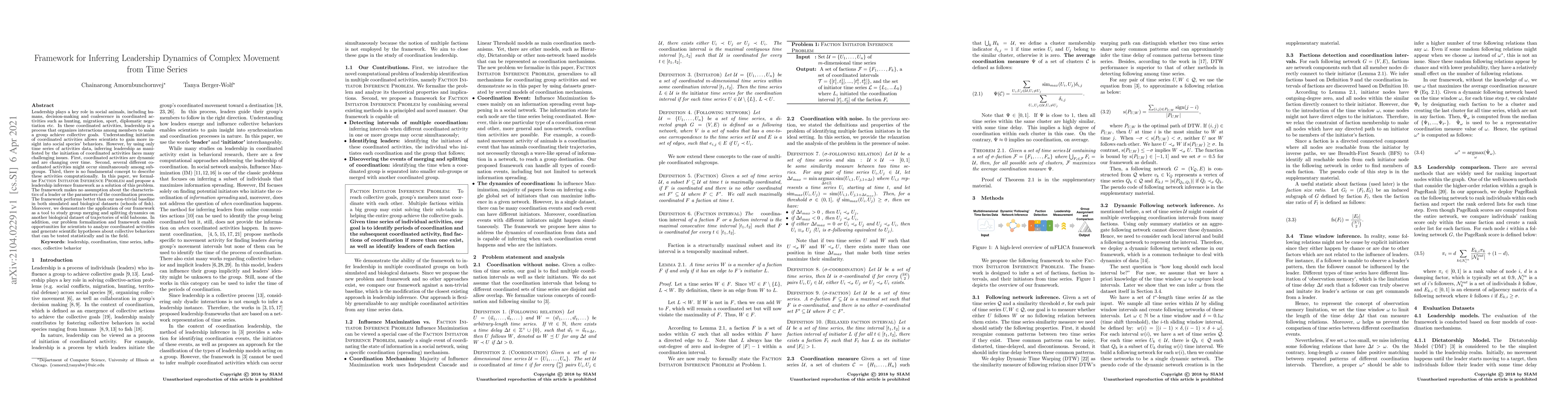 Leadership plays a key role in social animals, including humans, decision-making and coalescence in coordinated activities such as hunting, migration, sport, diplomatic negotiation etc. In these coordinated activities, leadership is a process that organizes interactions among members to make a group achieve collective goals. Understanding initiation of coordinated activities allows scientists to gain more insight into social species behaviors. However, by using only time series of activities data, inferring leadership as manifested by the initiation of coordinated activities faces many challenging issues. First, coordinated activities are dynamic and are changing over time. Second, several different coordinated activities might occur simultaneously among subgroups. Third, there is no fundamental concept to describe these activities computationally. In this paper, we formalize Faction Initiator Inference Problem and propose a leadership inference framework as a solution of this problem. The framework makes no assumption about the characteristics of a leader or the parameters of the coordination process. The framework performs better than our non-trivial baseline in both simulated and biological datasets (schools of fish). Moreover, we demonstrate the application of our framework as a tool to study group merging and splitting dynamics on another biological dataset of trajectories of wild baboons. In addition, our problem formalization and framework enable opportunities for scientists to analyze coordinated activities and generate scientific hypotheses about collective behaviors that can be tested statistically and in the field.
