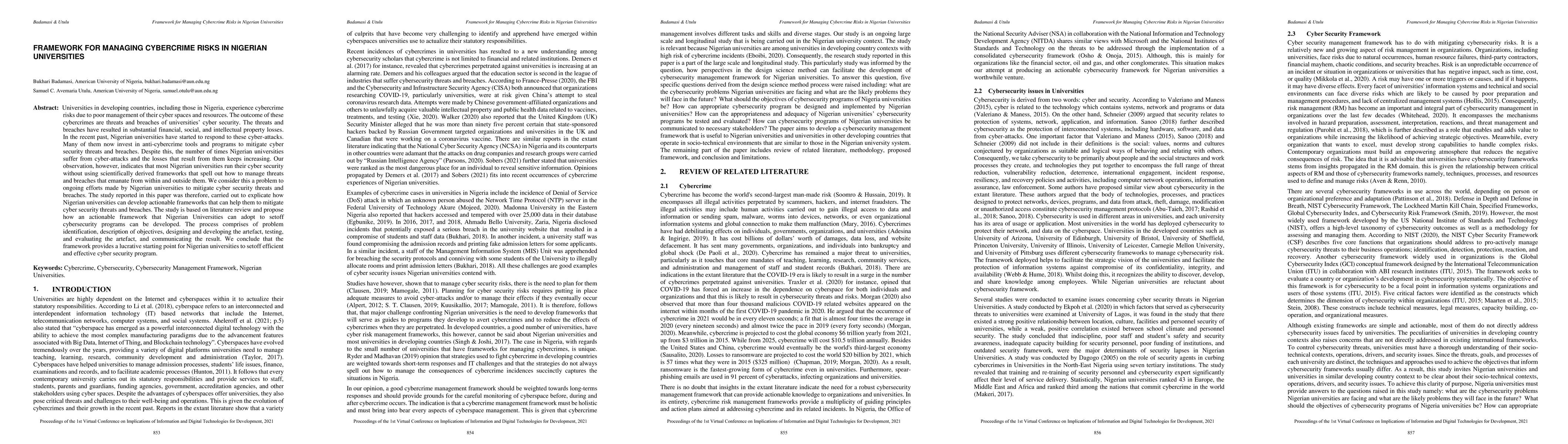 This paper proposes a framework for managing cybercrime risks in Nigerian universities, highlighting the need for scientifically derived strategies to mitigate increasing cyber security threats and breaches. The study suggests a structured process involving problem identification, objective setting, artefact development, testing, evaluation, and communication to create effective cybersecurity programs.