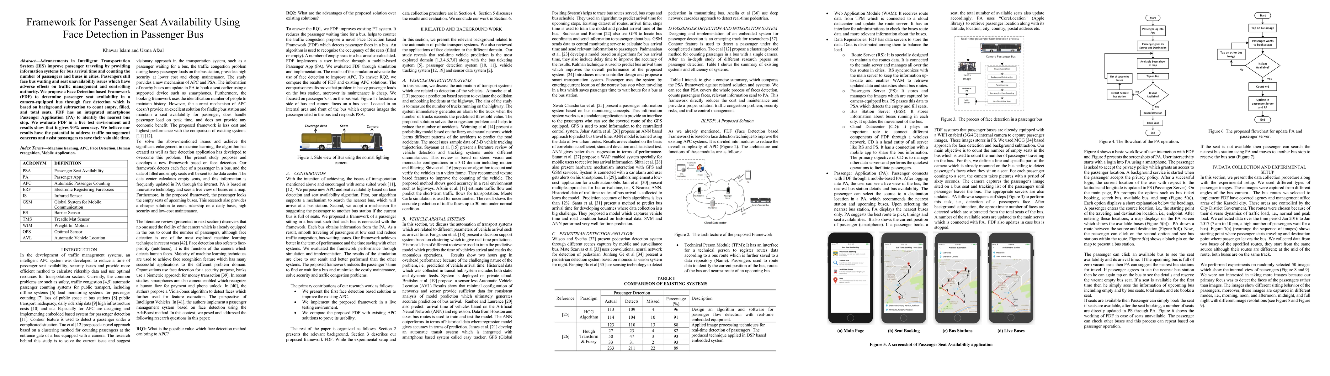 The paper proposes a Face Detection based Framework (FDF) to determine passenger seat availability in buses using face detection technology, which counts empty, filled, and total seats. The framework includes a smartphone application to help passengers find the nearest bus stop, and evaluation results show 90% accuracy.