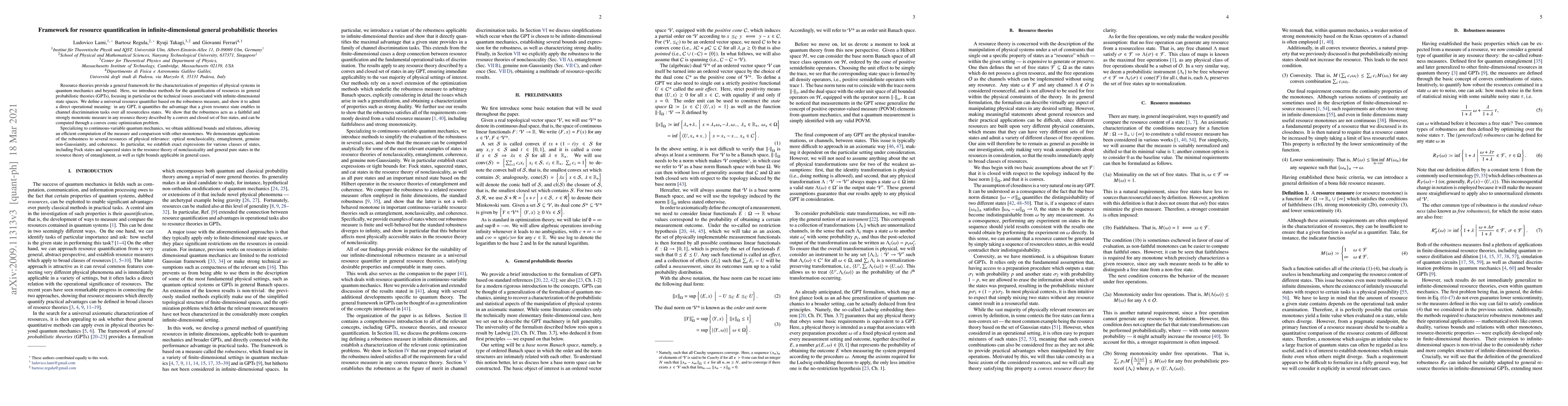 Resource theories provide a general framework for the characterization of properties of physical systems in quantum mechanics and beyond. Here, we introduce methods for the quantification of resources in general probabilistic theories (GPTs), focusing in particular on the technical issues associated with infinite-dimensional state spaces. We define a universal resource quantifier based on the robustness measure, and show it to admit a direct operational meaning: in any GPT, it quantifies the advantage that a given resource state enables in channel discrimination tasks over all resourceless states. We show that the robustness acts as a faithful and strongly monotonic measure in any resource theory described by a convex and closed set of free states, and can be computed through a convex conic optimization problem. Specializing to continuous-variable quantum mechanics, we obtain additional bounds and relations, allowing an efficient computation of the measure and comparison with other monotones. We demonstrate applications of the robustness to several resources of physical relevance: optical nonclassicality, entanglement, genuine non-Gaussianity, and coherence. In particular, we establish exact expressions for various classes of states, including Fock states and squeezed states in the resource theory of nonclassicality and general pure states in the resource theory of entanglement, as well as tight bounds applicable in general cases.