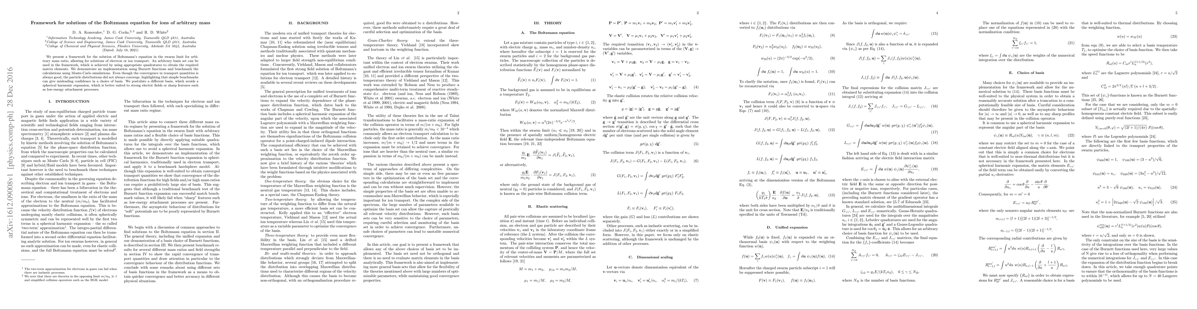 We present a framework for the solution of Boltzmann's equation in the swarm limit for arbitrary mass ratio, allowing for solutions of electron or ion transport. An arbitrary basis set can be used in the framework, which is achieved by using appropriate quadratures to obtain the required matrix elements. We demonstrate an implementation using Burnett functions and benchmark the calculations using Monte-Carlo simulations. Even though the convergence in transport quantities is always good, the particle distributions did not always converge, highlighting that simple benchmarks can give misleading confidence in a choice of basis. We postulate a different basis, which avoids a spherical harmonic expansion, which is better suited to strong electric fields or sharp features such as low-energy attachment processes.