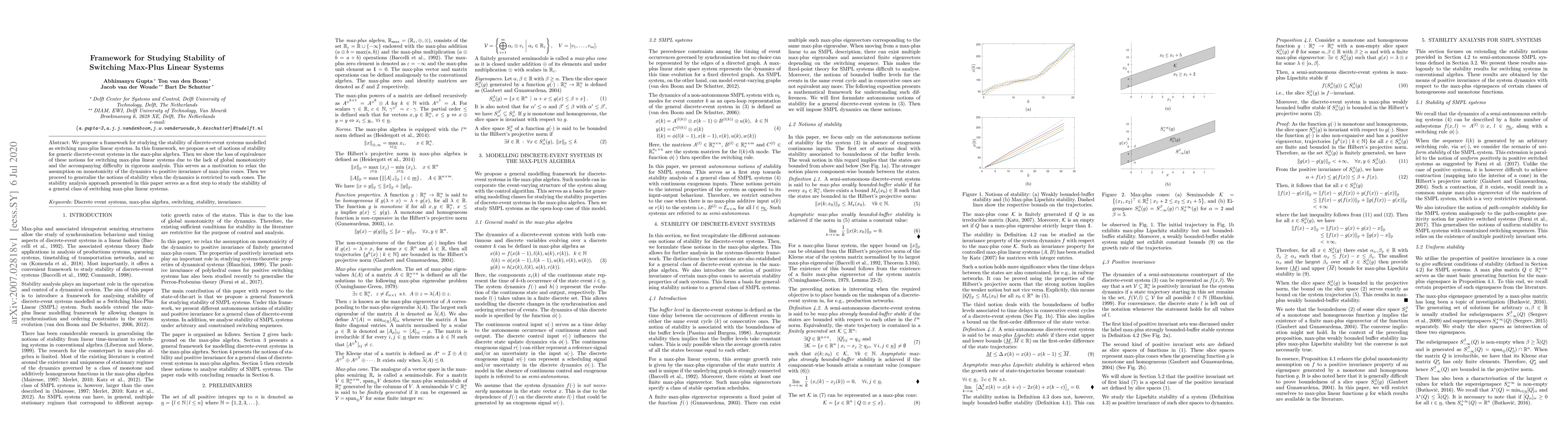 We propose a framework for studying the stability of discrete-event systems modelled as switching max-plus linear systems. In this framework, we propose a set of notions of stability for generic discrete-event systems in the max-plus algebra. Then we show the loss of equivalence of these notions for switching max-plus linear systems due to the lack of global monotonicity and the accompanying difficulty in rigorous analysis. This serves as a motivation to relax the assumption on monotonicity of the dynamics to positive invariance of max-plus cones. Then we proceed to generalise the notions of stability when the dynamics is restricted to such cones. The stability analysis approach presented in this paper serves as a first step to study the stability of a general class of switching max-plus linear systems.