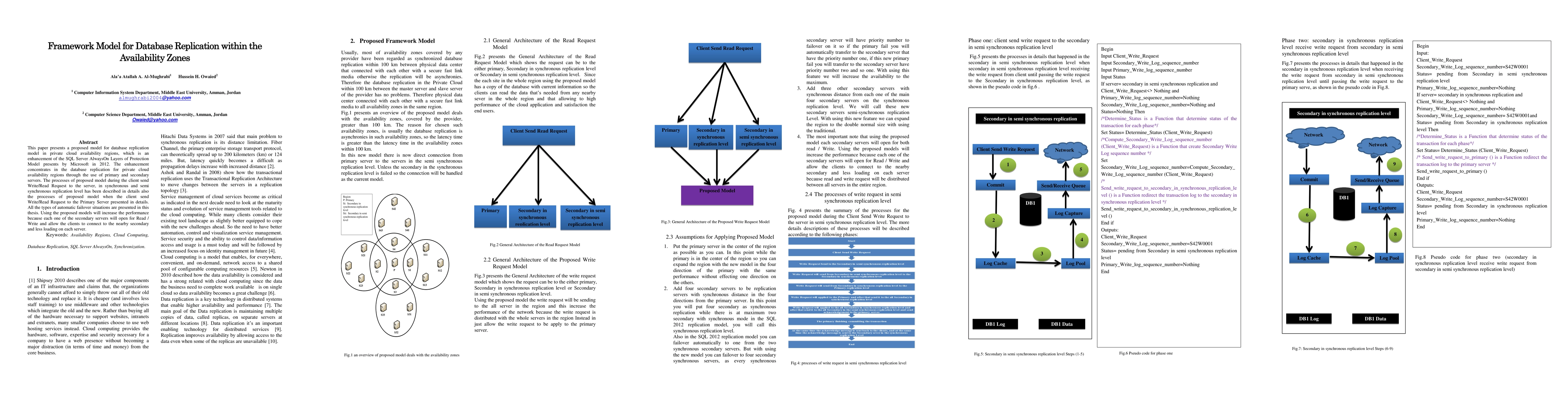This paper proposes a model for database replication within private cloud availability zones, enhancing Microsoft's SQL Server AlwaysOn Layers of Protection Model. It details synchronous and semi-synchronous replication processes and automatic failover scenarios, aiming to improve performance by allowing secondary servers to handle Read/Write requests and reduce server load.