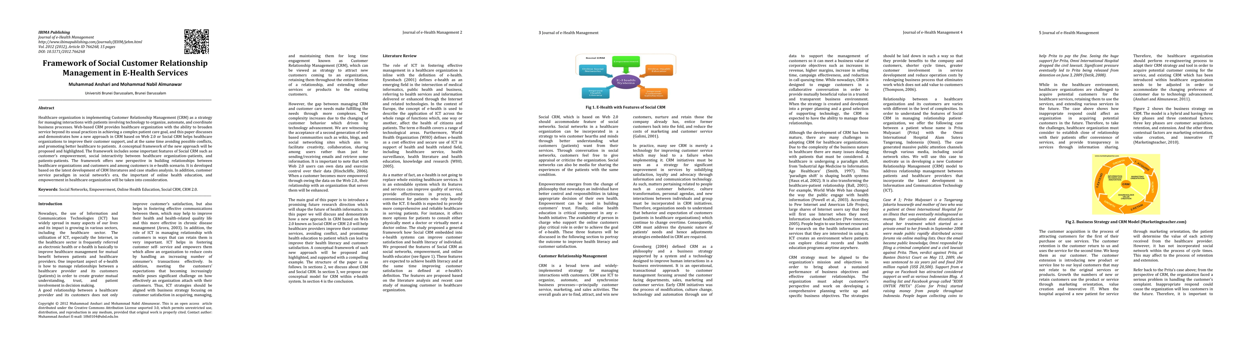 This paper proposes a conceptual framework for Social Customer Relationship Management (CRM) in e-health services, emphasizing the use of Web 2.0 technologies to enhance customer support, foster social interactivity, and empower patients, thereby improving healthcare outcomes and relationships. The framework is developed based on CRM literature and case studies.