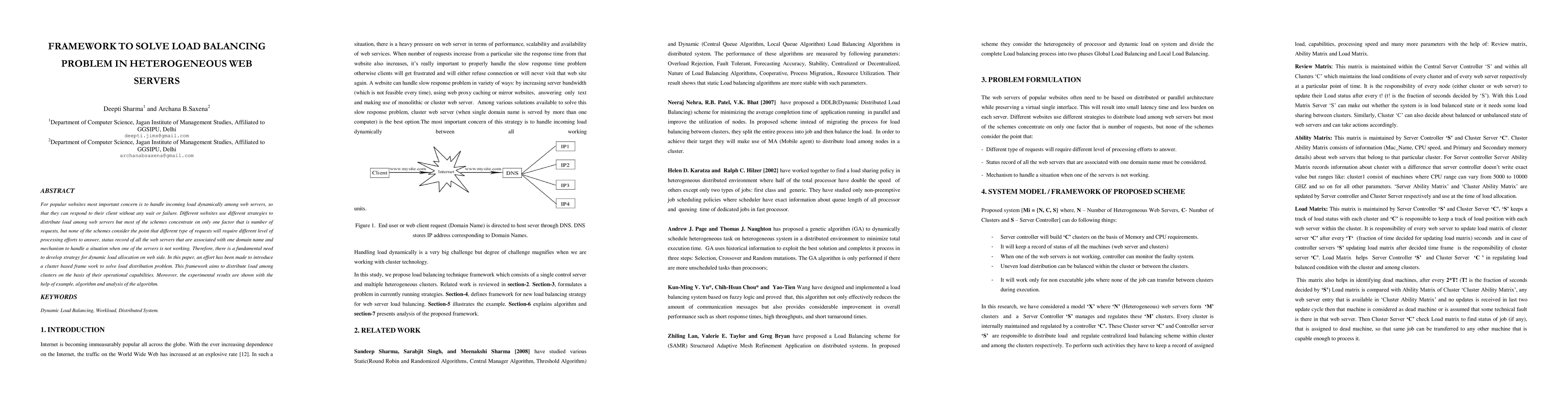 This paper proposes a cluster-based framework for dynamic load balancing in heterogeneous web servers, focusing on distributing load based on operational capabilities rather than just request numbers. Experimental results demonstrate the effectiveness of the proposed algorithm through examples and analysis.