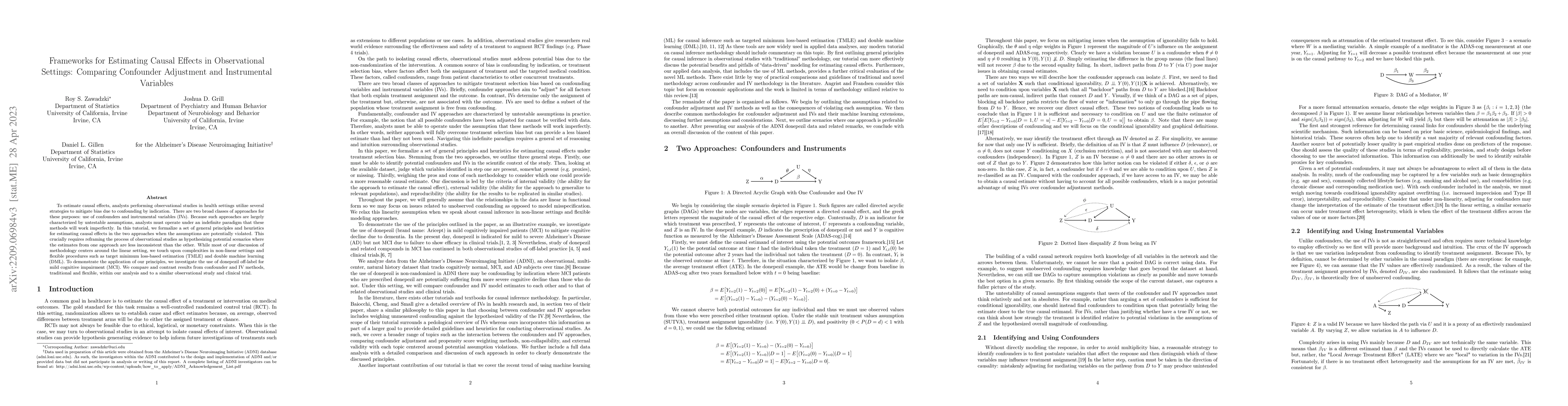 To estimate causal effects, analysts performing observational studies in health settings utilize several strategies to mitigate bias due to confounding by indication. There are two broad classes of approaches for these purposes: use of confounders and instrumental variables (IVs). Because such approaches are largely characterized by untestable assumptions, analysts must operate under an indefinite paradigm that these methods will work imperfectly. In this tutorial, we formalize a set of general principles and heuristics for estimating causal effects in the two approaches when the assumptions are potentially violated. This crucially requires reframing the process of observational studies as hypothesizing potential scenarios where the estimates from one approach are less inconsistent than the other. While most of our discussion of methodology centers around the linear setting, we touch upon complexities in non-linear settings and flexible procedures such as target minimum loss-based estimation (TMLE) and double machine learning (DML). To demonstrate the application of our principles, we investigate the use of donepezil off-label for mild cognitive impairment (MCI). We compare and contrast results from confounder and IV methods, traditional and flexible, within our analysis and to a similar observational study and clinical trial.