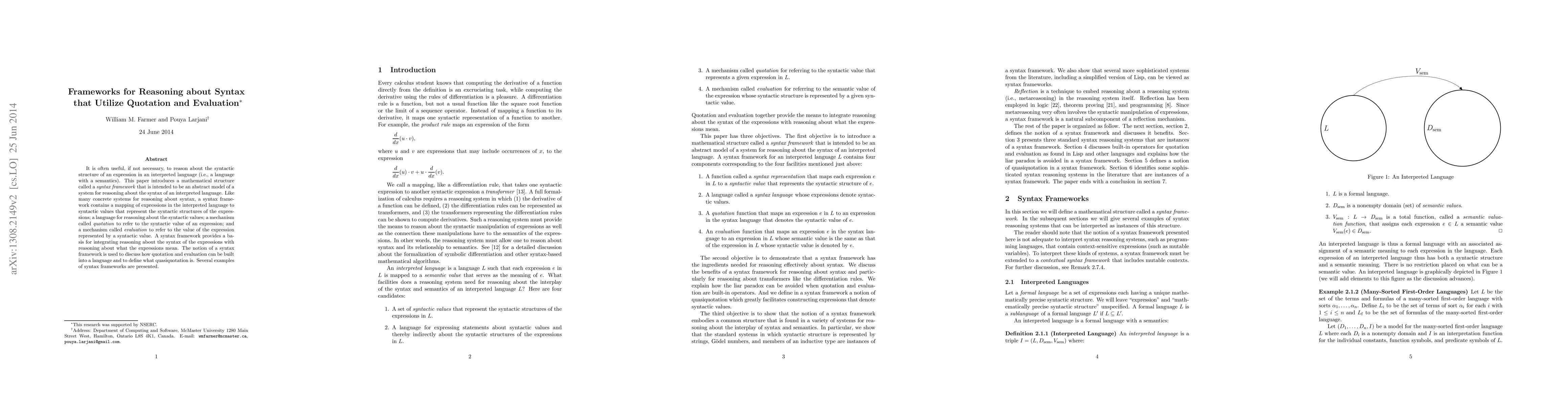 This paper proposes a mathematical structure called a syntax framework to abstractly model systems for reasoning about the syntax of interpreted languages, featuring quotation and evaluation mechanisms. It discusses how these frameworks integrate syntactic and semantic reasoning and provides examples of such frameworks.