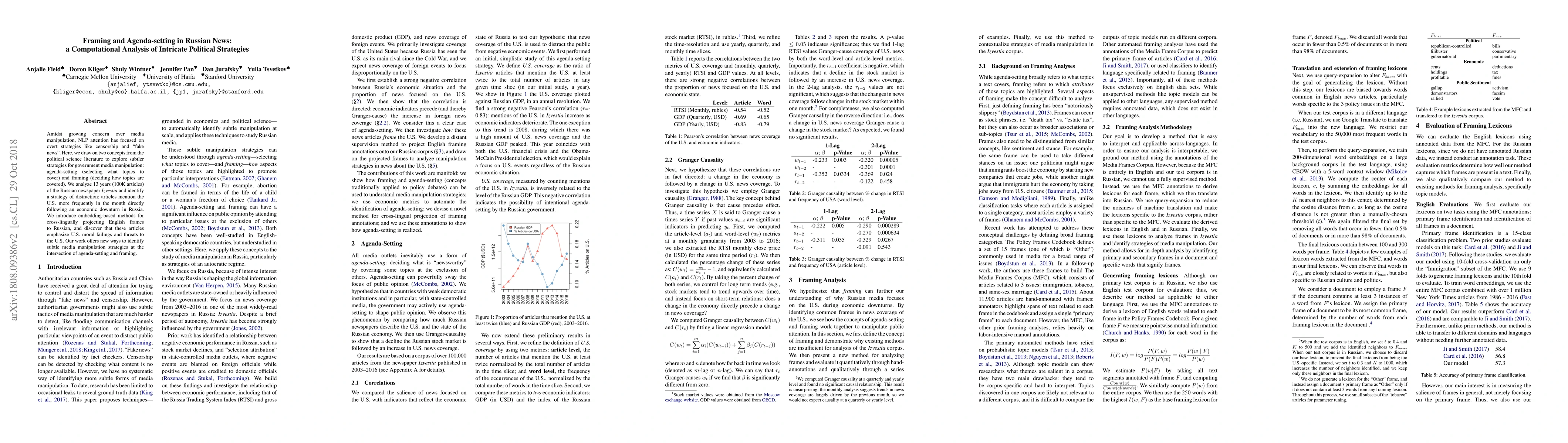 This paper examines subtle political strategies in Russian media using computational analysis of 100K articles from Izvestia over 13 years, revealing a distraction tactic where U.S. mentions spike post-Russian economic downturns, framing U.S. as morally flawed and a threat. The study employs embedding-based methods for cross-lingual frame projection.