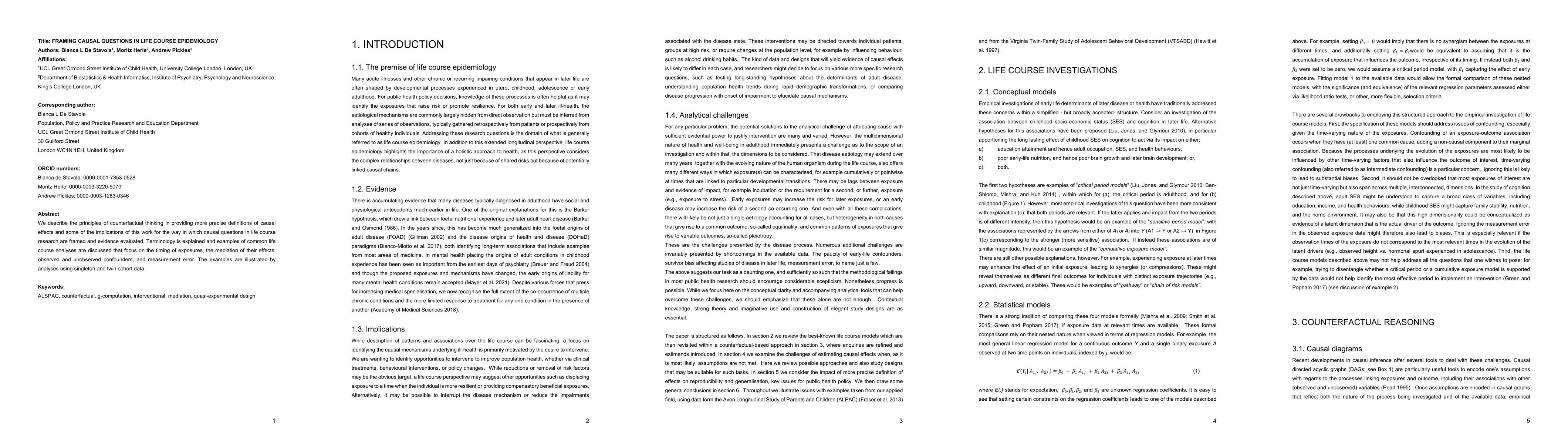 We describe the principles of counterfactual thinking in providing more precise definitions of causal effects and some of the implications of this work for the way in which causal questions in life course research are framed and evidence evaluated. Terminology is explained and examples of common life course analyses are discussed that focus on the timing of exposures, the mediation of their effects, observed and unobserved confounders, and measurement error. The examples are illustrated by analyses using singleton and twin cohort data.