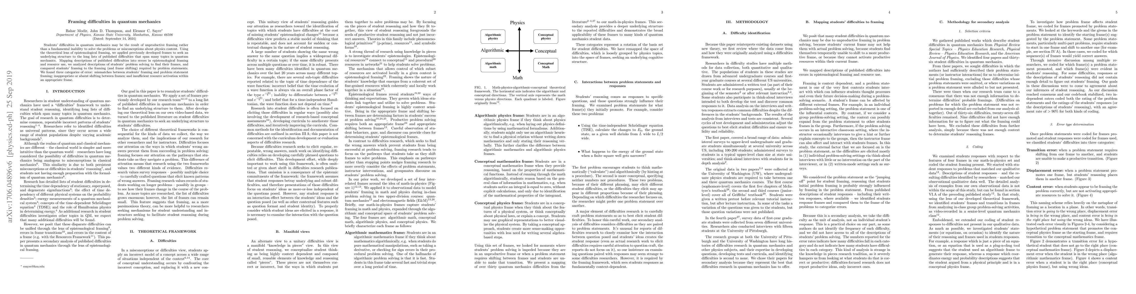Students' difficulties in quantum mechanics may be the result of unproductive framing rather than a fundamental inability to solve the problems or misconceptions about physics content. Using the theoretical lens of epistemological framing, we applied previously developed frames to seek an underlying structure to the long lists of published difficulties that span many topics in quantum mechanics. Mapping descriptions of published difficulties into errors in epistemological framing and resource use, we analyzed descriptions of students' problem solving to find their frames, and compared students' framing to the framing (and frame shifting) required by problem statements. We found three categories of error: mismatches between students' framing and problem statement framing; inappropriate or absent shifting between frames; and insufficient resource activation within an appropriate frame.