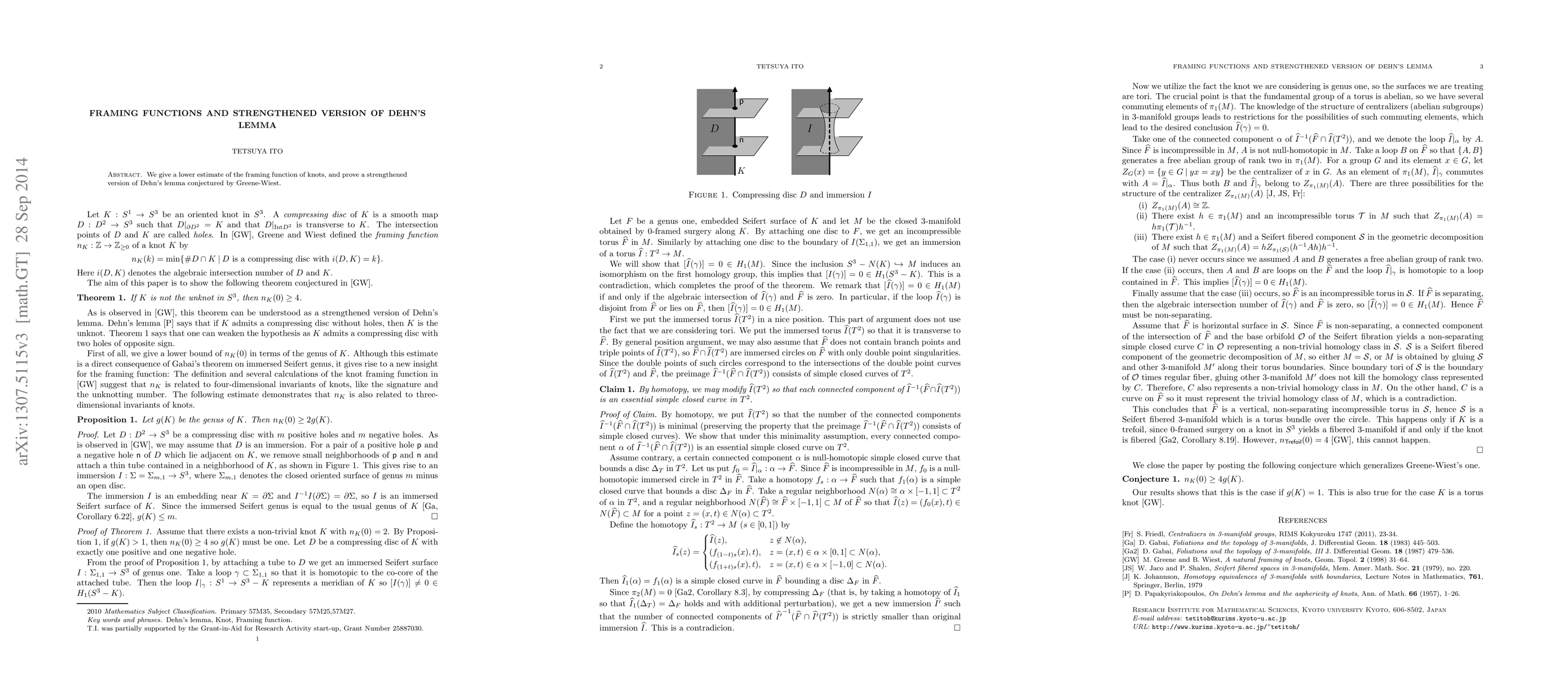 We give a lower estimate of the framing function of knots, and prove a strengthened version of Dehn's lemma conjectured by Greene-Wiest.