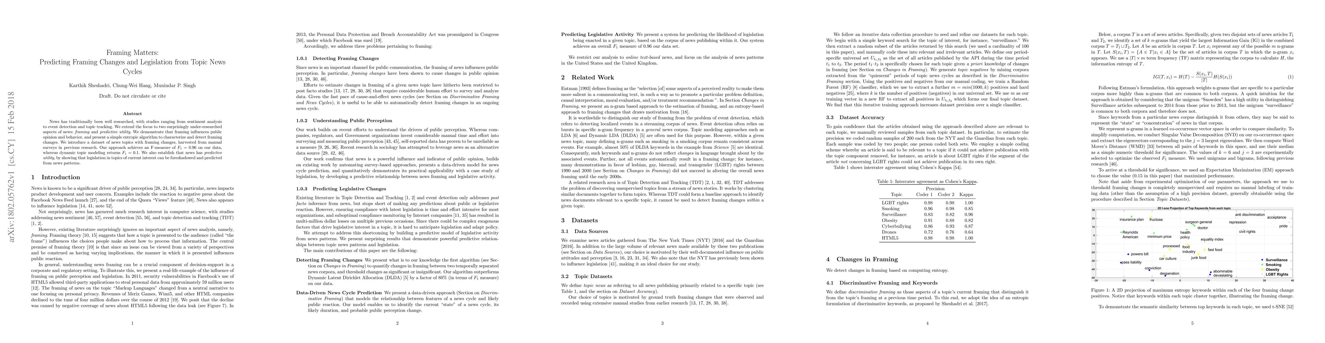 News has traditionally been well researched, with studies ranging from sentiment analysis to event detection and topic tracking. We extend the focus to two surprisingly under-researched aspects of news: \emph{framing} and \emph{predictive utility}. We demonstrate that framing influences public opinion and behavior, and present a simple entropic algorithm to characterize and detect framing changes. We introduce a dataset of news topics with framing changes, harvested from manual surveys in previous research. Our approach achieves an F-measure of $F_1=0.96$ on our data, whereas dynamic topic modeling returns $F_1=0.1$. We also establish that news has \emph{predictive utility}, by showing that legislation in topics of current interest can be foreshadowed and predicted from news patterns.