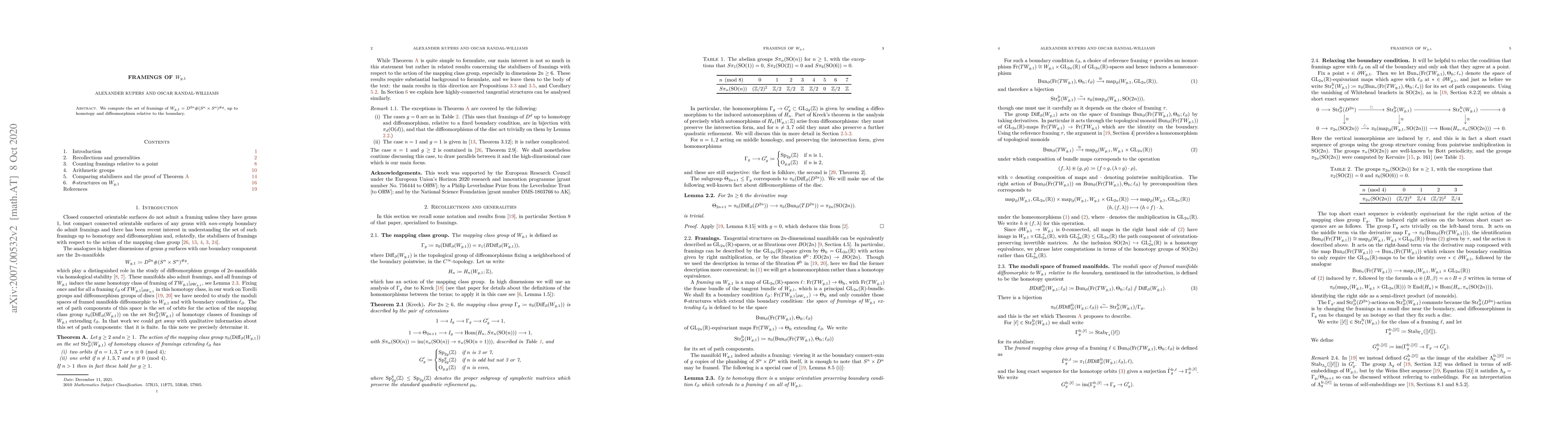 We compute the set of framings of $W_{g,1} = D^{2n} \# (S^n \times S^n)^{\# g}$, up to homotopy and diffeomorphism relative to the boundary.