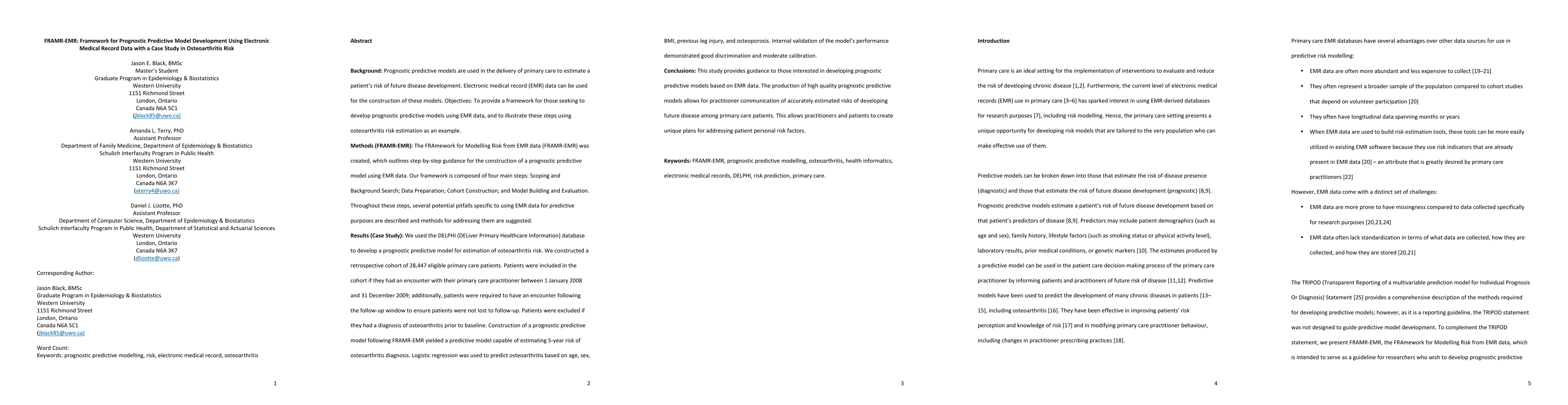 Background-Prognostic predictive models are used in the delivery of primary care to estimate a patients risk of future disease development. Electronic medical record, EMR, data can be used for the construction of these models. Objectives- To provide a framework for those seeking to develop prognostic predictive models using EMR data, and to illustrate these steps using osteoarthritis risk estimation as an example. FRAMR-EMR-The FRAmework for Modelling Risk from EMR data, FRAMR-EMR, was created, which outlines step-by-step guidance for the construction of a prognostic predictive model using EMR data. Throughout these steps, several potential pitfalls specific to using EMR data for predictive purposes are described and methods for addressing them are suggested. Case Study-We used the DELPHI, DELiver Primary Healthcare Information, database to develop our prognostic predictive model for estimation of osteoarthritis risk. We constructed a retrospective cohort of 28447 eligible primary care patients. Patients were included if they had an encounter with their primary care practitioner between 1 January 2008 and 31 December 2009. Patients were excluded if they had a diagnosis of osteoarthritis prior to baseline. Construction of a prognostic predictive model following FRAMR-EMR yielded a predictive model capable of estimating 5-year risk of osteoarthritis diagnosis. Logistic regression was used to predict osteoarthritis based on age, sex, BMI, previous leg injury, and osteoporosis. Internal validation of the models performance demonstrated good discrimination and moderate calibration. Conclusions-This study provides guidance to those interested in developing prognostic predictive models based on EMR data. The production of high quality prognostic predictive models allows for practitioner communication of accurately estimated risks of developing future disease among primary care patients.
