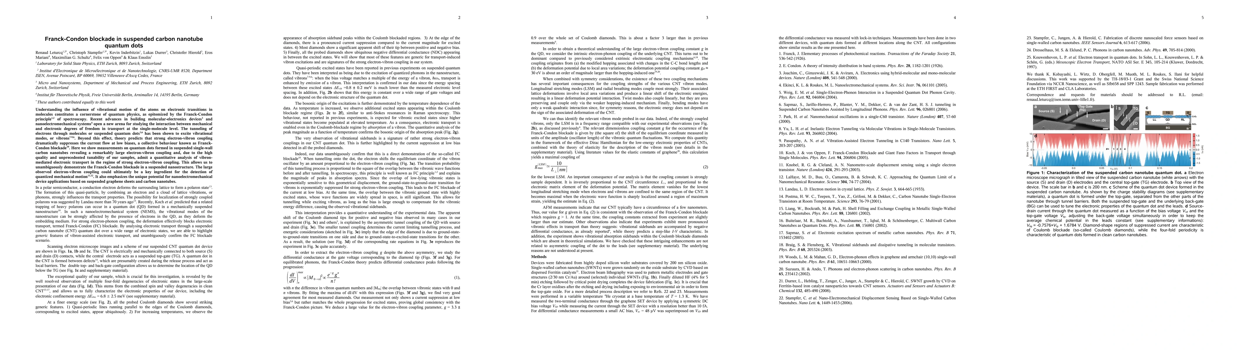 This paper demonstrates the Franck-Condon blockade in suspended single-wall carbon nanotube quantum dots, revealing strong electron-vibron coupling and suppressing current flow at low biases. The findings highlight the potential for nanoelectromechanical devices based on carbon nanotubes.