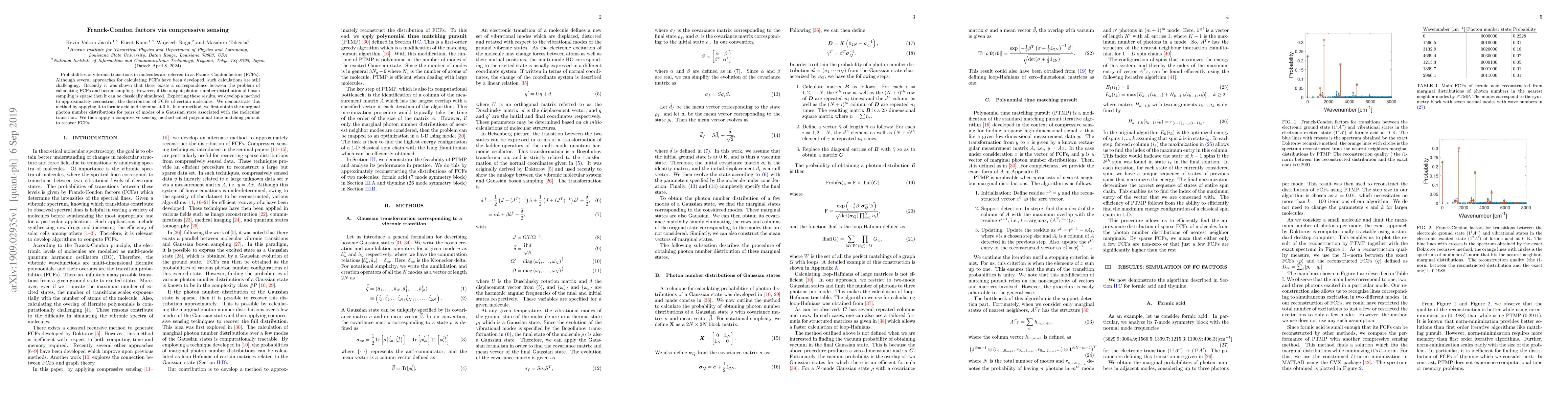 This paper proposes a method using compressive sensing to approximate Franck-Condon factors for molecular vibronic transitions, leveraging the correspondence between FCF calculation and boson sampling. The method applies polynomial-time matching pursuit to reconstruct FCFs from sparse photon number distributions, demonstrated on formic acid and thymine at 0 K.