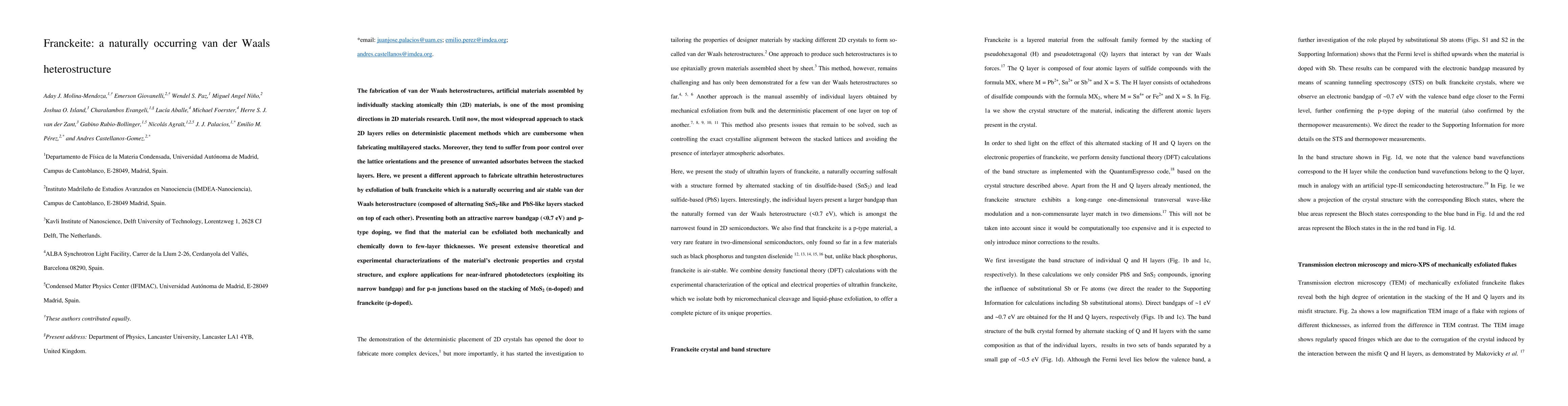 Franckeite, a naturally occurring van der Waals heterostructure, presents a novel approach to fabricating ultrathin heterostructures by exfoliating its alternating SnS2-like and PbS-like layers, offering potential for near-infrared photodetectors and p-n junctions. The material exhibits a narrow bandgap and p-type doping, making it suitable for advanced electronic applications.