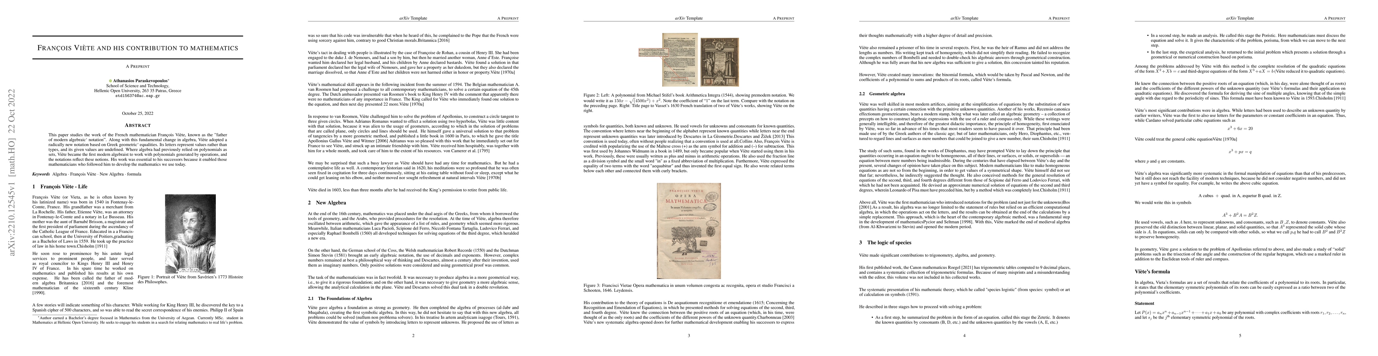This paper studies the work of the French mathematician Francois Viete, known as the "father of modern algebraic notation". Along with this fundamental change in algebra, Viete adopted a radically new notation based on Greek geometric equalities. Its letters represent values rather than types, and its given values are undefined. Where algebra had previously relied on polynomials as sets, Viete became the first modern algebraist to work with polynomials generated by operations, and the notations reflect these notions. His work was essential to his successors because it enabled those mathematicians who followed him to develop the mathematics we use today.