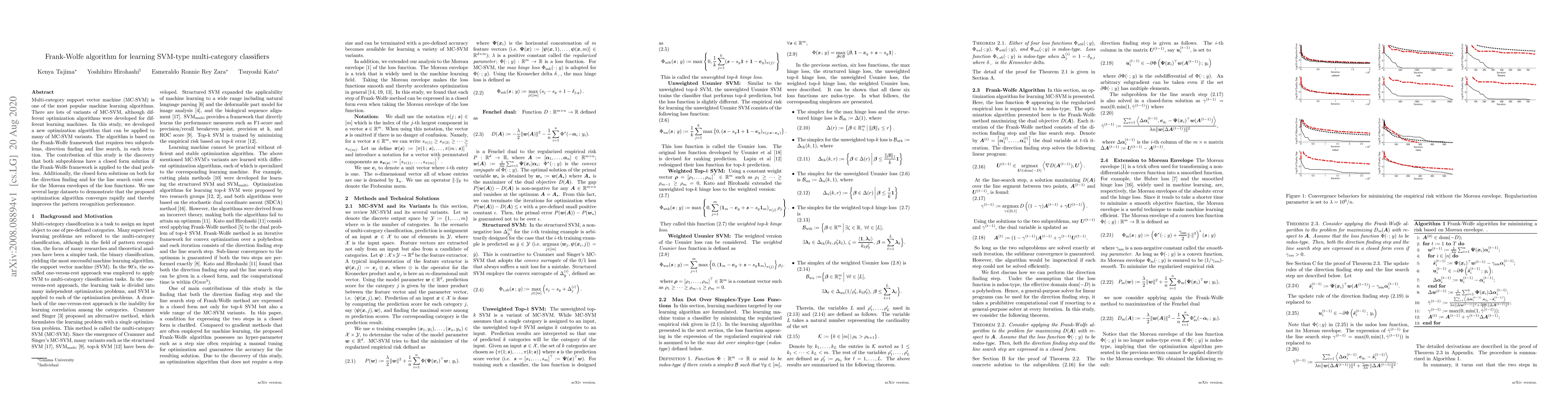 Multi-category support vector machine (MC-SVM) is one of the most popular machine learning algorithms. There are lots of variants of MC-SVM, although different optimization algorithms were developed for different learning machines. In this study, we developed a new optimization algorithm that can be applied to many of MC-SVM variants. The algorithm is based on the Frank-Wolfe framework that requires two subproblems, direction finding and line search, in each iteration. The contribution of this study is the discovery that both subproblems have a closed form solution if the Frank-Wolfe framework is applied to the dual problem. Additionally, the closed form solutions on both for the direction finding and for the line search exist even for the Moreau envelopes of the loss functions. We use several large datasets to demonstrate that the proposed optimization algorithm converges rapidly and thereby improves the pattern recognition performance.