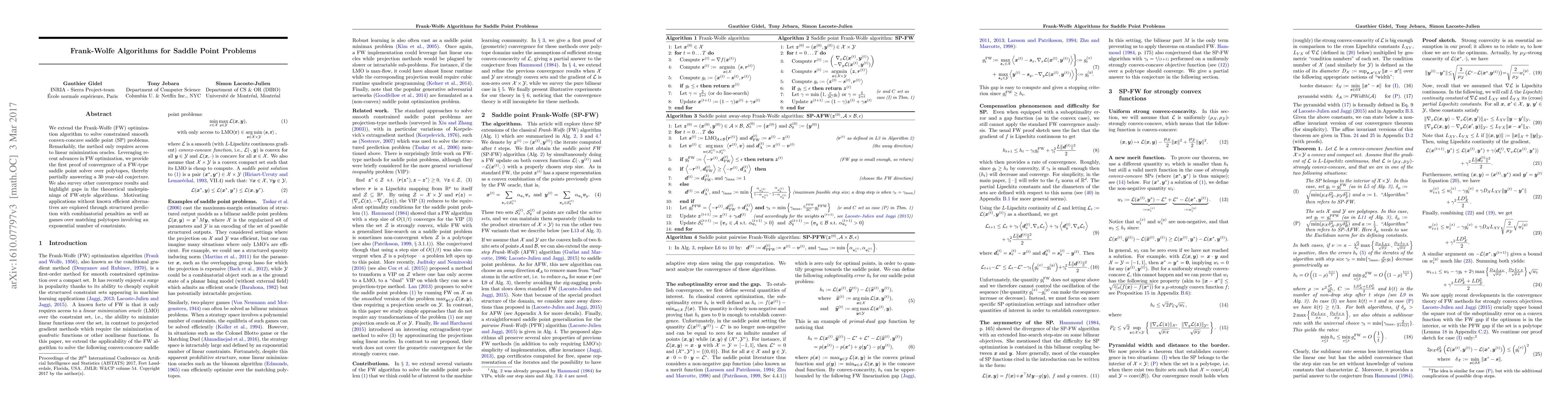 We extend the Frank-Wolfe (FW) optimization algorithm to solve constrained smooth convex-concave saddle point (SP) problems. Remarkably, the method only requires access to linear minimization oracles. Leveraging recent advances in FW optimization, we provide the first proof of convergence of a FW-type saddle point solver over polytopes, thereby partially answering a 30 year-old conjecture. We also survey other convergence results and highlight gaps in the theoretical underpinnings of FW-style algorithms. Motivating applications without known efficient alternatives are explored through structured prediction with combinatorial penalties as well as games over matching polytopes involving an exponential number of constraints.