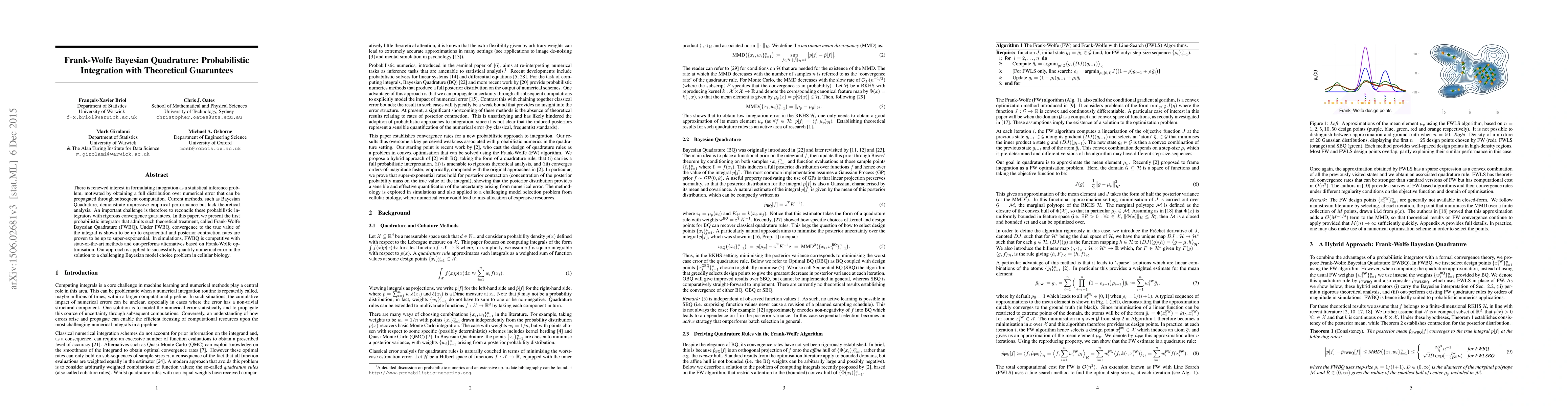 This paper introduces Frank-Wolfe Bayesian Quadrature (FWBQ), a probabilistic integration method that provides rigorous theoretical convergence guarantees. FWBQ demonstrates exponential convergence and superexponential posterior contraction rates, outperforming alternatives in simulations and successfully quantifying numerical error in a cellular biology model choice problem.