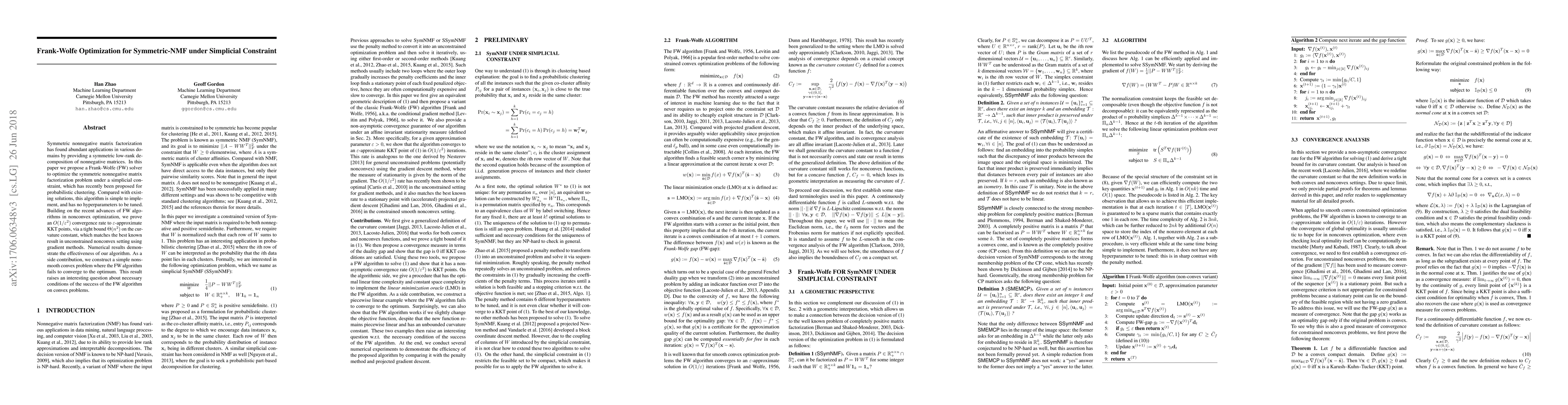 This paper introduces a Frank-Wolfe (FW) algorithm for symmetric nonnegative matrix factorization under a simplicial constraint, simpler to implement with no tunable hyperparameters. It proves an O(1/ε^2) convergence rate, matching the best known result for unconstrained nonconvex settings, and validates its effectiveness through numerical experiments.