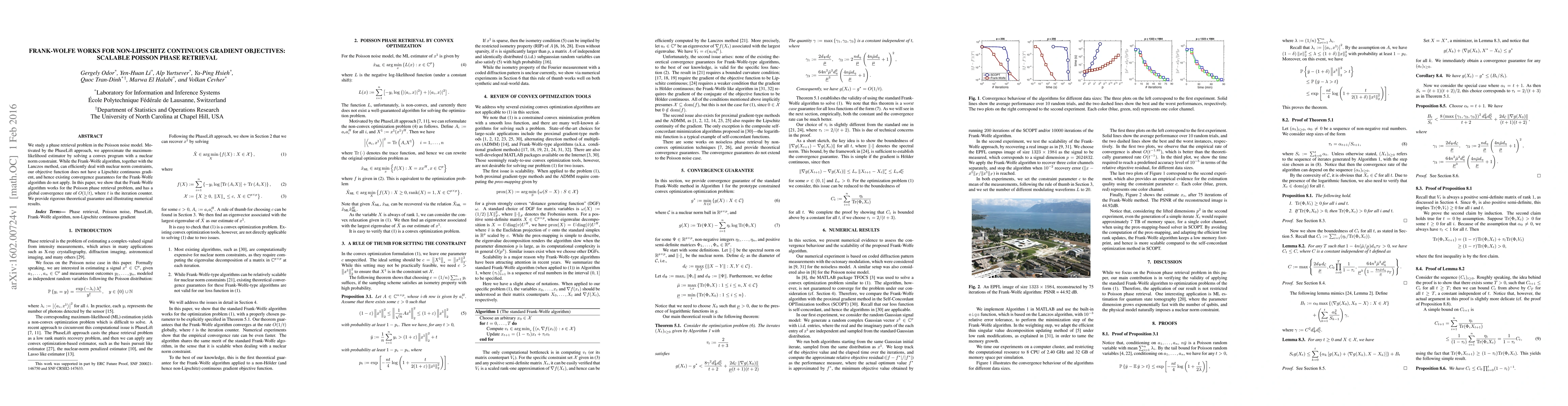 This paper investigates the application of the Frank-Wolfe algorithm to solve a non-Lipschitz continuous gradient objective in Poisson phase retrieval. Despite the non-standard gradient, the authors demonstrate the algorithm's global convergence rate of O(1/t) and provide both theoretical proofs and numerical validation.