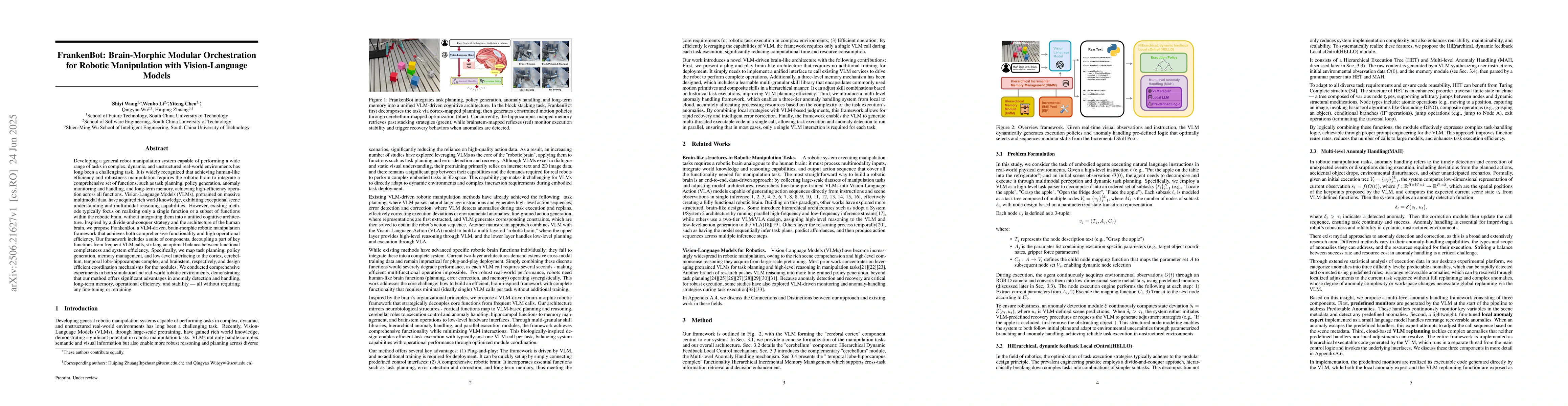 Developing a general robot manipulation system capable of performing a wide range of tasks in complex, dynamic, and unstructured real-world environments has long been a challenging task. It is widely recognized that achieving human-like efficiency and robustness manipulation requires the robotic brain to integrate a comprehensive set of functions, such as task planning, policy generation, anomaly monitoring and handling, and long-term memory, achieving high-efficiency operation across all functions. Vision-Language Models (VLMs), pretrained on massive multimodal data, have acquired rich world knowledge, exhibiting exceptional scene understanding and multimodal reasoning capabilities. However, existing methods typically focus on realizing only a single function or a subset of functions within the robotic brain, without integrating them into a unified cognitive architecture. Inspired by a divide-and-conquer strategy and the architecture of the human brain, we propose FrankenBot, a VLM-driven, brain-morphic robotic manipulation framework that achieves both comprehensive functionality and high operational efficiency. Our framework includes a suite of components, decoupling a part of key functions from frequent VLM calls, striking an optimal balance between functional completeness and system efficiency. Specifically, we map task planning, policy generation, memory management, and low-level interfacing to the cortex, cerebellum, temporal lobe-hippocampus complex, and brainstem, respectively, and design efficient coordination mechanisms for the modules. We conducted comprehensive experiments in both simulation and real-world robotic environments, demonstrating that our method offers significant advantages in anomaly detection and handling, long-term memory, operational efficiency, and stability -- all without requiring any fine-tuning or retraining.